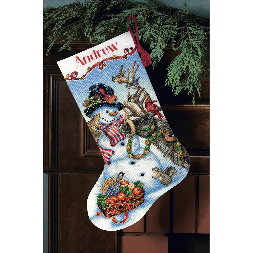 This year, hang a homemade Christmas stocking above the fireplace! The Gold Collection Counted Cross Stitch Personalized Christmas Stocking Kit features a happy snowman and his animal friends! Personalize this Christmas craft by stitching the name of a , friend, or loved above the cute Christmas scene! Includes 18 count white Aida, presorted thread, wool yarn, metallic thread, felt, needle, and easy to instructions with alphabet for personalization. Completed kit measures 16'' long. Snowman Gathering stocking kit includes 18 count white Aida, presorted thread, wool yarn, metallic thread, felt, needle, and easy to instructions with alphabet for personalization. Completed Snowman Gathering personalize stocking measures 16'' long. This year, hang a homemade Christmas stocking above the fireplace with the Snowman Gathering Personalized Stocking Kit! This Snowman themed advanced cross stitch kit includes easy to instructions to help you craft a monogrammed Christmas stocking for someone special. Use the included cross stitch alphabet to personalize your Snowman Christmas stocking with the name of a , friend, or loved !