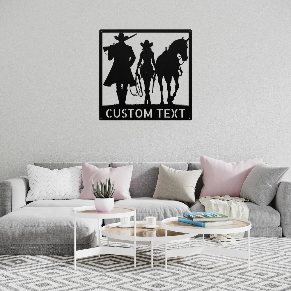 Product Description Personalized Cowboy Cowgirl with Horse Metal Sign Custom Wall Art Decor Gift Add a touch of western charm to your space with our Personalized Cowboy Cowgirl with Horse Metal Sign ! This custom wall art decor is perfect for horse lovers and those who embrace the cowboy lifestyle. Made from high-quality 16-gauge metal, this sign features a durable powder coating that protects it from dust, weather, and water, ensuring it looks great both indoors and outdoors. Looking for the perfect gift? This personalized metal sign makes an excellent choice for Christmas, birthdays, or any special occasion. It’s a unique way to celebrate the bond between cowboys, cowgirls, and their horses. Key Features: Customizable Design : Personalize the sign with a name or special message. Durable Material : Crafted from 16-gauge high-quality metal for long-lasting use. Weather-Resistant : Powder-coated finish protects against dust, rain, and rust. Versatile Decor : Ideal for both indoor and outdoor display. Great Gift Idea : A thoughtful present for any cowboy or cowgirl. Show off your love for the cowboy lifestyle or surprise a friend with this beautiful metal sign. Order yours today and add a personal touch to your decor! Service and Color Choice Our metal signs are designed to be personalized just for you, making them the perfect addition to any space! The default color for our signs is Black , but we also offer a variety of beautiful options including Copper, Gold, White, and Silver . After placing your order, simply contact us with your preferred color choice, and we'll ensure your sign is exactly how you envision it. Let’s create something special together!