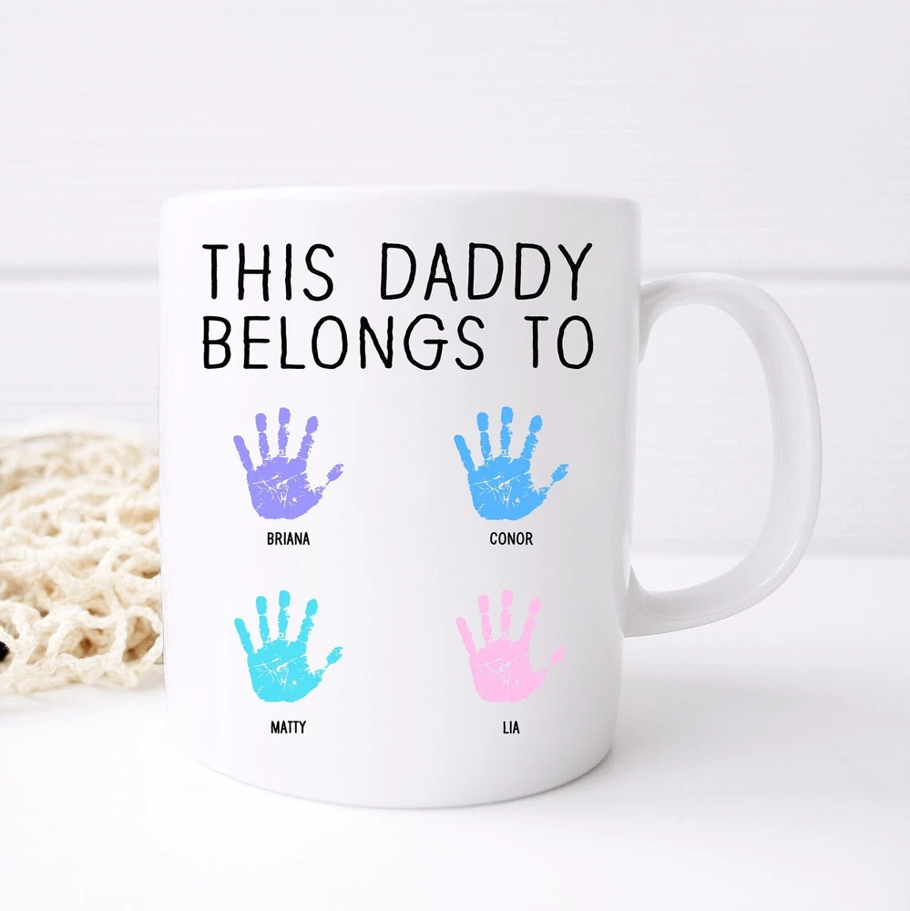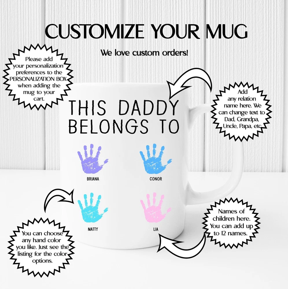 Personalized Dad Mug This Daddy Belongs To Mug Watercolor Handprint Coffee Mug Product Details.. This high quality 11oz. ceramic white mug has a premium hard coat that provides crisp and vibrant color reproduction sure to last for years. Perfect for all hot & cold beverages. The highest quality printing possible is used. It will never fade no matter how many times you wash it. Material: 100% Ceramic. Print both sides. Dishwasher and Microwave Safe. High Gloss + Premium White Finish. Printed in the U.S.A. Personalized & Custom. We support personalized and custom mug to add custom, when placing an order, you can add notes to the "order note" in shipping address section. Also you can contact us directly via message. Shipping Info. Ready to ship in 1 to 2 business days, All products are made-to-order and proudly printed in the United States. Shipped by USPS and DHL, You will receive your order in 5-7 days. Replace & Refund. All products are defective during shipping broken, chipped will be replaced free of charge. You are not satisfied with the product, we will refund 100% money to you. If any other issues arise, please do not hesitate to message, we would be more than happy to assist you.