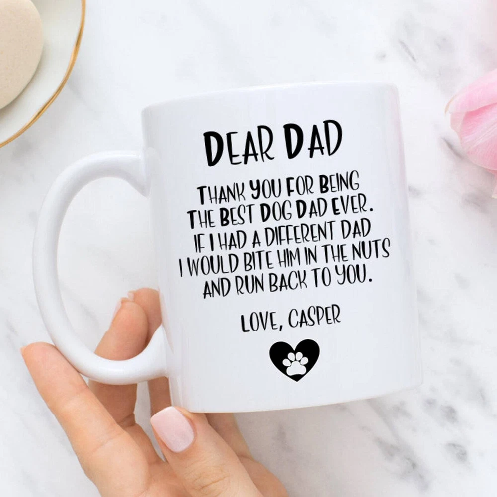 Personalized Dog Dad Mug Dog Owner Gift Dog Dad Gift Product Details.. This high quality 11oz. ceramic white mug has a premium hard coat that provides crisp and vibrant color reproduction sure to last for years. Perfect for all hot & cold beverages. The highest quality printing possible is used. It will never fade no matter how many times you wash it. Material: 100% Ceramic. Print both sides. Dishwasher and Microwave Safe. High Gloss + Premium White Finish. Printed in the U.S.A. Personalized & Custom. We support personalized and custom mug to add custom, when placing an order, you can add notes to the "order note" in shipping address section. Also you can contact us directly via message. Shipping Info. Ready to ship in 1 to 2 business days, All products are made-to-order and proudly printed in the United States. Shipped by USPS and DHL, You will receive your order in 5-7 days. Replace & Refund. All products are defective during shipping broken, chipped will be replaced free of charge. You are not satisfied with the product, we will refund 100% money to you. If any other issues arise, please do not hesitate to message, we would be more than happy to assist you.