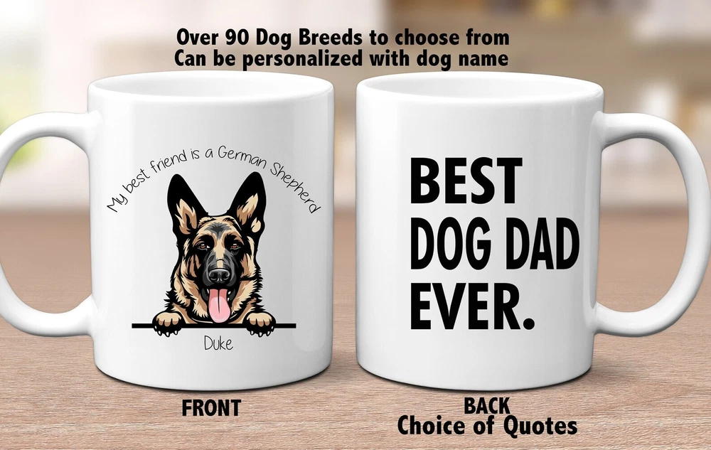 Personalized Dog Mug Best Dog Dad Mug Dog Mom Mug Dog Lover Gift Custom Dog Dad Product Details.. This high quality 11oz. ceramic white mug has a premium hard coat that provides crisp and vibrant color reproduction sure to last for years. Perfect for all hot & cold beverages. The highest quality printing possible is used. It will never fade no matter how many times you wash it. Material: 100% Ceramic. Print both sides. Dishwasher and Microwave Safe. High Gloss + Premium White Finish. Printed in the U.S.A. Personalized & Custom. We support personalized and custom mug to add custom, when placing an order, you can add notes to the "order note" in shipping address section. Also you can contact us directly via message. Shipping Info. Ready to ship in 1 to 2 business days, All products are made-to-order and proudly printed in the United States. Shipped by USPS and DHL, You will receive your order in 5-7 days. Replace & Refund. All products are defective during shipping broken, chipped will be replaced free of charge. You are not satisfied with the product, we will refund 100% money to you. If any other issues arise, please do not hesitate to message, we would be more than happy to assist you.