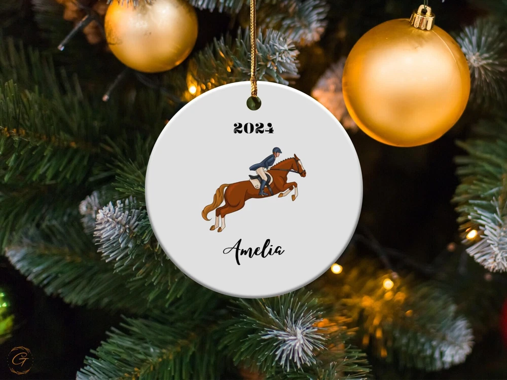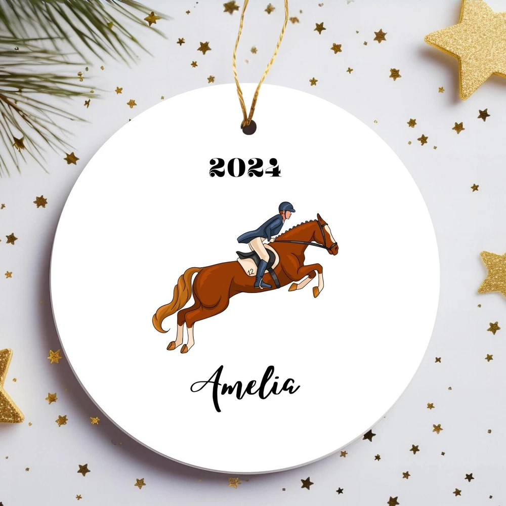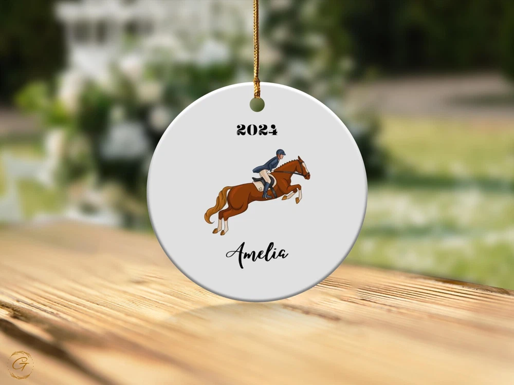 Personalized Equestrian Horse Rider Ornament Personalized Horse Decor Custom Name Christmas Decor Equestrian Gift For Riders Horse Lover Material: Ceramic Color: White Shapes: Circle, star, heart and oval Can be printed on both sides Imprint full-color artwork, photos, or logos Hole for hanging string and hanging string included Printed in the USA