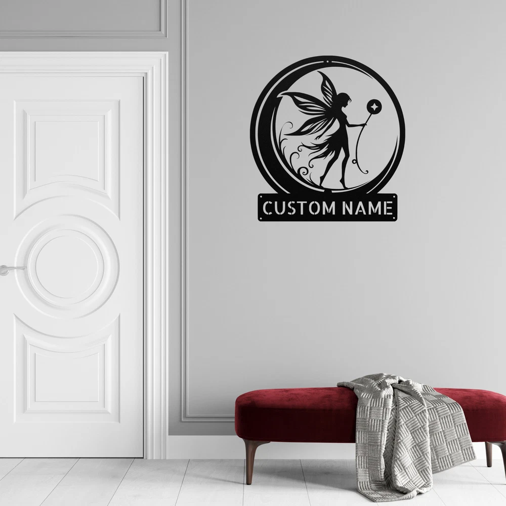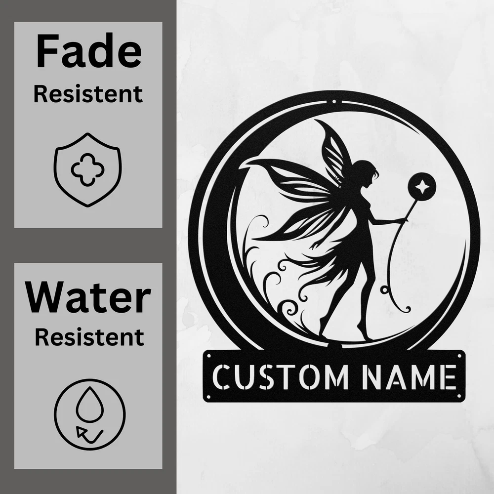 Product Description Personalized Fairy Moon Metal Sign Custom Decor Gift for Birthdays and Holidays Add a touch of magic to your space with the enchanting Personalized Fairy Moon Metal Sign . This beautiful sign captures the whimsical spirit of fairies and moons, making it a perfect decoration for any room in your home or office. Crafted from 16 gauge high-quality metal , this sign is designed to last. The powder coating gives it a durable finish that is dust, weather, and water-resistant, so it can be displayed both indoors and outdoors without worry. Key features include: Customizable Design: Personalize with names or special messages for a unique touch. Durable Construction: Made from high-quality metal for long-lasting beauty. Perfect Gift: A thoughtful present for Christmas, birthdays, or any special occasion. Whimsical Decor: Ideal for children’s rooms, nurseries, or anyone who loves fairy tales. The Personalized Fairy Moon Metal Sign is not just a decoration; it’s a delightful piece that brings a sense of wonder and imagination to your home. Make your space magical and celebrate special moments with this charming sign! Service and Color Choice Our metal signs are designed to be personalized just for you, making them the perfect addition to any space! The default color for our signs is Black , but we also offer a variety of beautiful options including Copper, Gold, White, and Silver . After placing your order, simply contact us with your preferred color choice, and we'll ensure your sign is exactly how you envision it. Let’s create something special together!