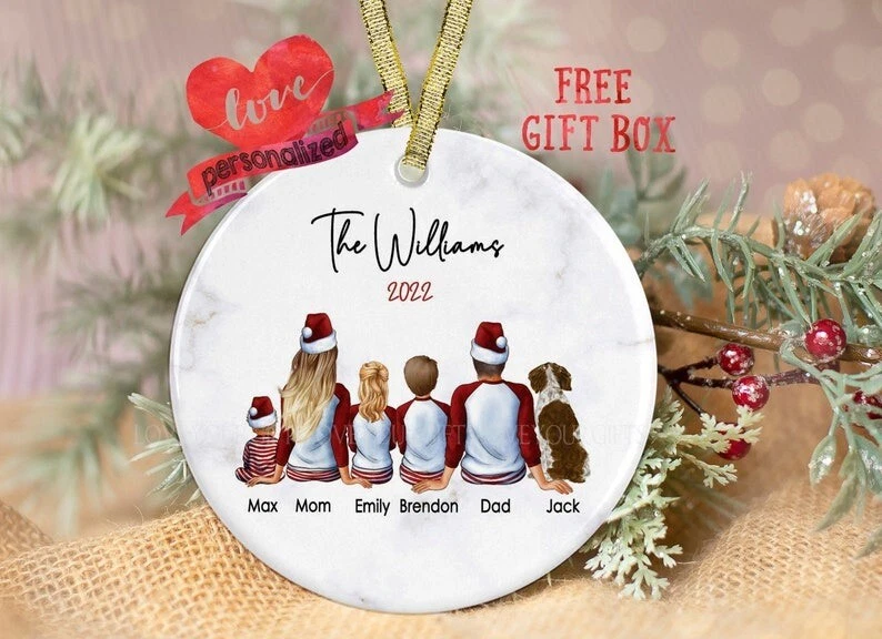 Personalized Family Christmas Ornament with Pets New Family Ornament Custom Family Ornament Dog Ornament Cat Ornament Our First Christmas If you need to buy more, please inbox us We have two material options (Ceramic & MDF), please read the product description as below to choose your favorite options. MDF Ornaments 1-sided design. Print type: Sublimation printing. Crafted from durable MDF with a high-gloss plastic finish so your designs last a lifetime. Shapes: Round, star, heart and oval . Product Dimensions: Circle & Heart, 2.75” tall; Oval & Star, 3.25” tall. Ships with a festive gold cord for easy hanging. CERAMIC Ornaments 125" (3mm), 2.75" height (circle), thick high-quality porcelain One-sided print Hole for the hanging string Gold-toned string included Available in 4 shapes - Snowflake, Star, Heart and Circle The height of the hole can slightly deviate Shipping, Return and Refund Policy On average, merchandise is produced and shipped from our facility 2-4 business days after purchase. Standard Shipping: 5-7 working days for USA. Please contact us if you have any dissatisfaction with the item you buy so that we give you the solution. It is easier for us to handle your issue if you send us the proof like an image. We can replace another within 30 days without fee if the item is defective, damaged, or an error is made on our end.