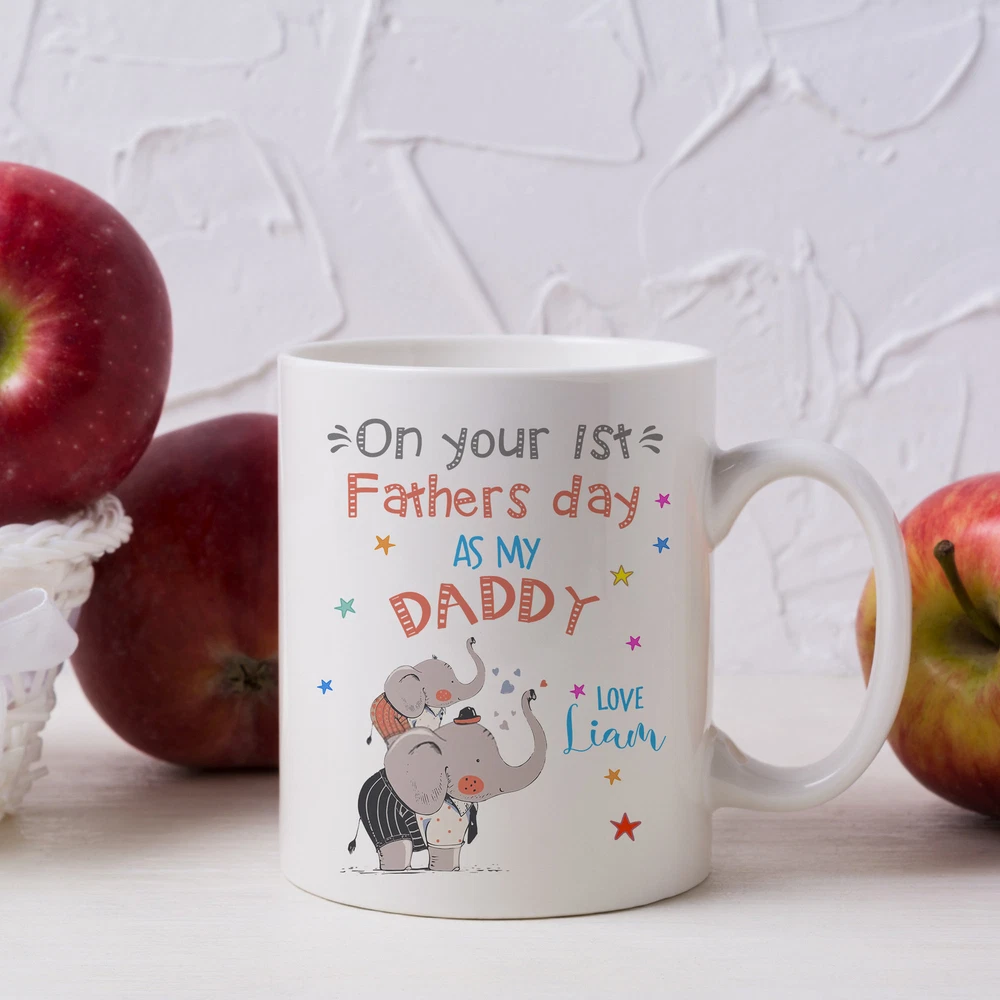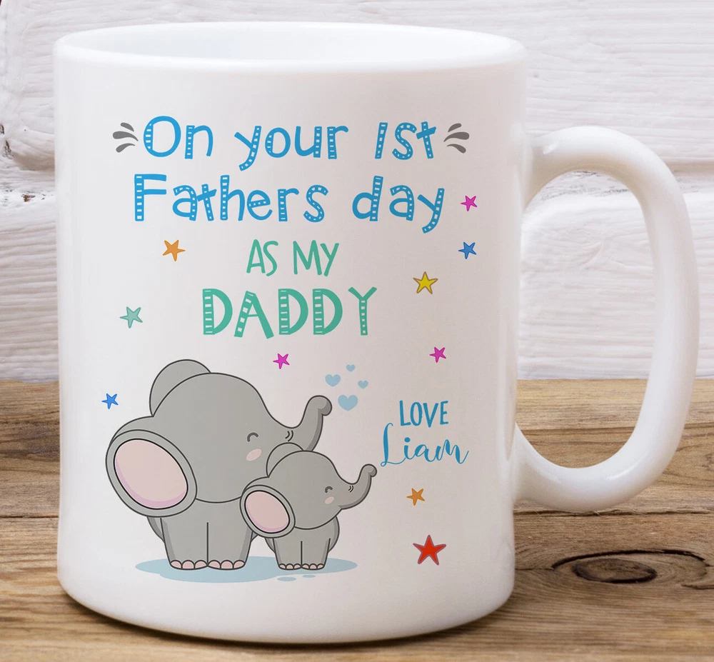 Personalized First Fathers Day Dad Baby Elephant Gift Baby Shower Gift Dad Mug Product Details.. This high quality 11oz. ceramic white mug has a premium hard coat that provides crisp and vibrant color reproduction sure to last for years. Perfect for all hot & cold beverages. The highest quality printing possible is used. It will never fade no matter how many times you wash it. Material: 100% Ceramic. Print both sides. Dishwasher and Microwave Safe. High Gloss + Premium White Finish. Printed in the U.S.A. Personalized & Custom. We support personalized and custom mug to add custom, when placing an order, you can add notes to the "order note" in shipping address section. Also you can contact us directly via message. Shipping Info. Ready to ship in 1 to 2 business days, All products are made-to-order and proudly printed in the United States. Shipped by USPS and DHL, You will receive your order in 5-7 days. Replace & Refund. All products are defective during shipping broken, chipped will be replaced free of charge. You are not satisfied with the product, we will refund 100% money to you. If any other issues arise, please do not hesitate to message, we would be more than happy to assist you.