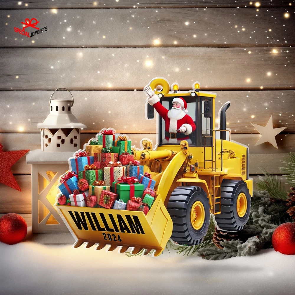 Personalized Front Loader 2d Flat Printed Acrylic Ornament Not 3d Santa On The Excavator Xmas Gift For Boys Christmas Gifts For Kids Material: Ceramic Color: White Shapes: Circle, star, heart and oval Can be printed on both sides Imprint full-color artwork, photos, or logos Hole for hanging string and hanging string included Printed in the USA