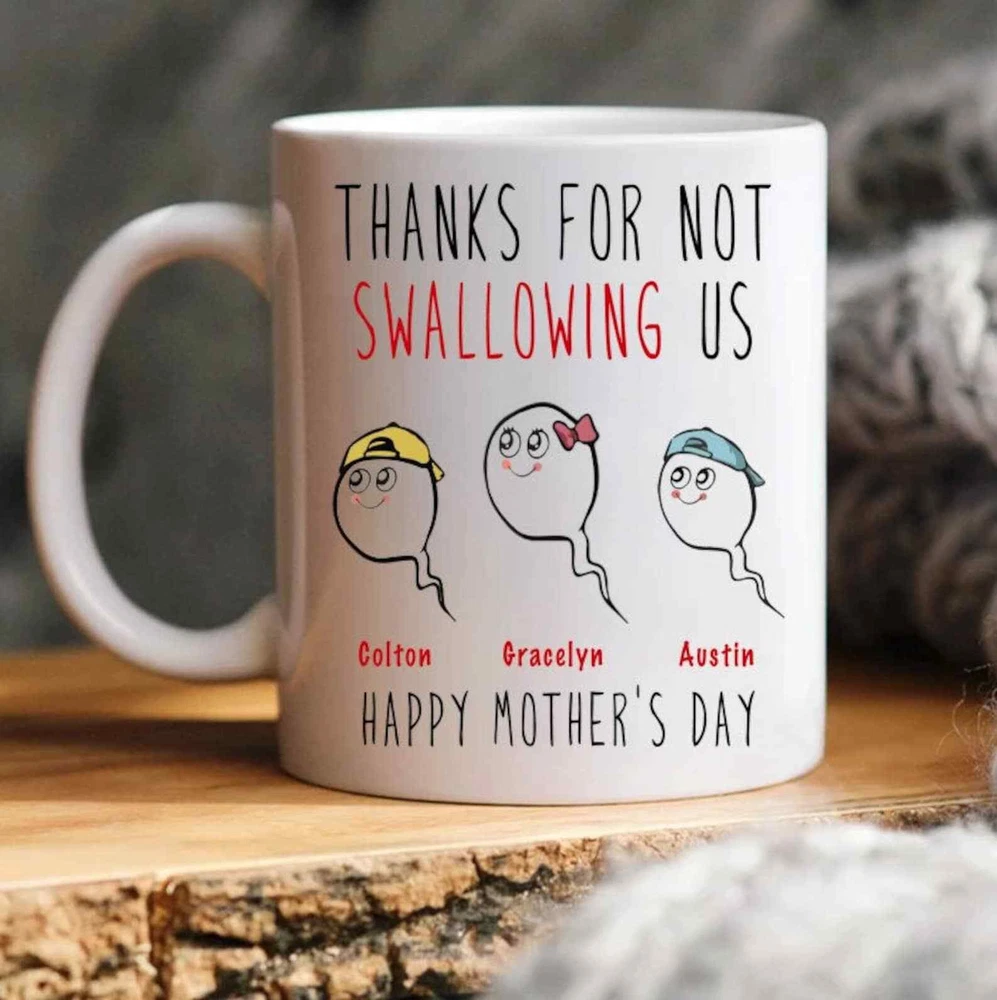 Personalized Funny Thanks For Not Swallowing Us Mug Custom Kid Name Mug Funny Mom Mug Mothers Day Gift Gift For Mom Birthday Mama Gift Product Details.. This high quality 11oz. ceramic white mug has a premium hard coat that provides crisp and vibrant color reproduction sure to last for years. Perfect for all hot & cold beverages. The highest quality printing possible is used. It will never fade no matter how many times you wash it. Material: 100% Ceramic. Print both sides. Dishwasher and Microwave Safe. High Gloss + Premium White Finish. Printed in the U.S.A. Personalized & Custom. We support personalized and custom mug to add custom, when placing an order, you can add notes to the "order note" in shipping address section. Also you can contact us directly via message. Shipping Info. Ready to ship in 1 to 2 business days, All products are made-to-order and proudly printed in the United States. Shipped by USPS and DHL, You will receive your order in 5-7 days. Replace & Refund. All products are defective during shipping broken, chipped will be replaced free of charge. You are not satisfied with the product, we will refund 100% money to you. If any other issues arise, please do not hesitate to message, we would be more than happy to assist you.