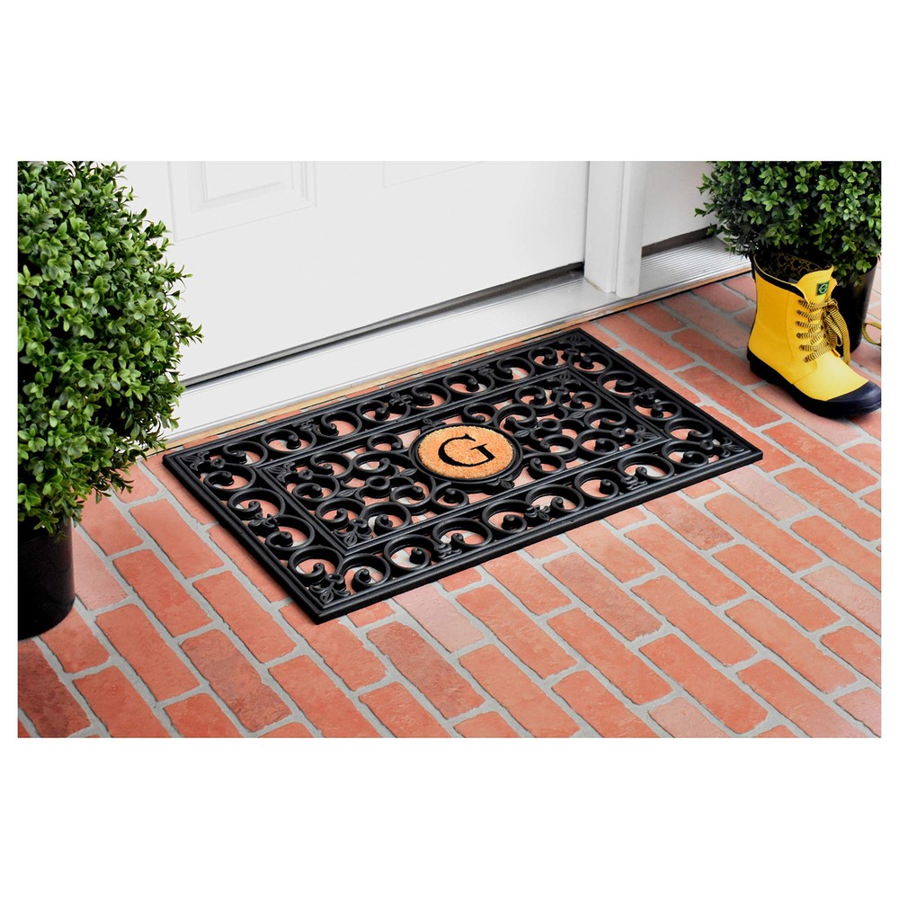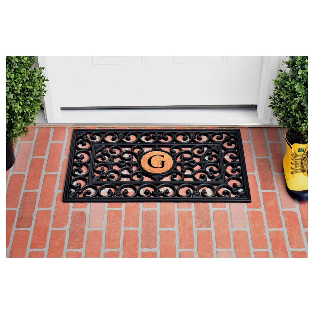 Beautifully designed scroll with a look of wrought iron makes this attractive and durable 100% rubber doormat a great addition to your homes exterior. The removable coir letter fits inside the middle circle and the entire mat can be hosed clean. Durable rubber that won't crack or buckle Removable coir center monogram Resists fading Dimensions: 18" x 30" x 0.60" Hoses clean