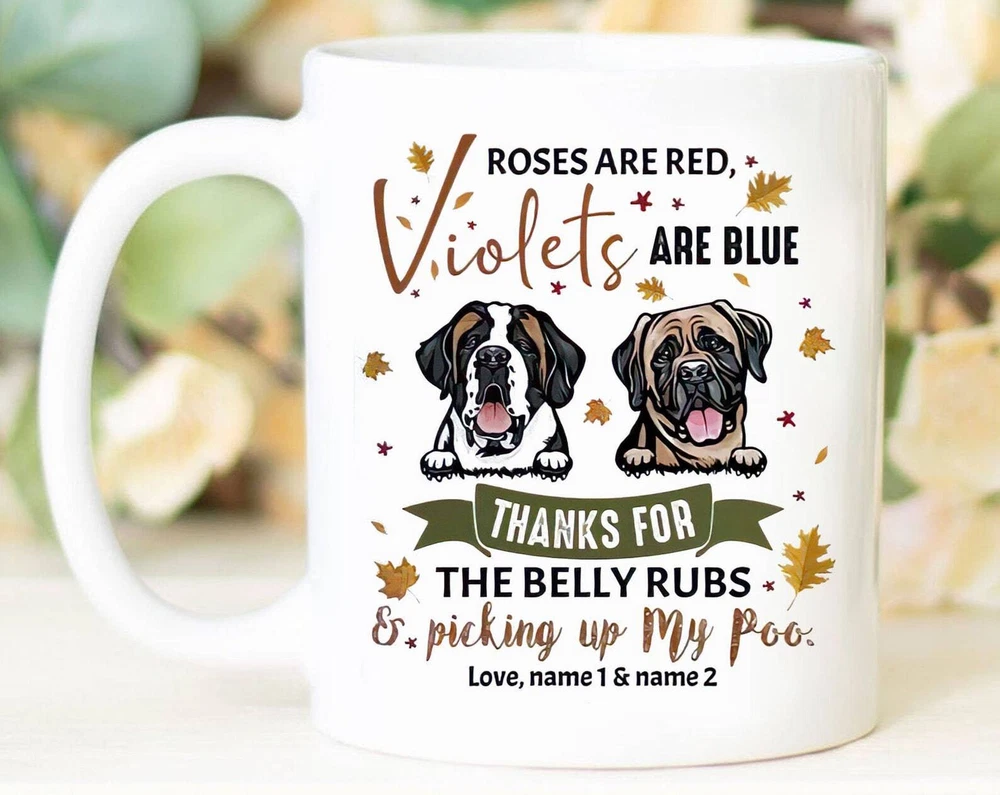Personalized Gift For Dog Lover Roses Are Red Violoet Are Blue Fall Mug Dog Mom Product Details.. This high quality 11oz. ceramic white mug has a premium hard coat that provides crisp and vibrant color reproduction sure to last for years. Perfect for all hot & cold beverages. The highest quality printing possible is used. It will never fade no matter how many times you wash it. Material: 100% Ceramic. Print both sides. Dishwasher and Microwave Safe. High Gloss + Premium White Finish. Printed in the U.S.A. Personalized & Custom. We support personalized and custom mug to add custom, when placing an order, you can add notes to the "order note" in shipping address section. Also you can contact us directly via message. Shipping Info. Ready to ship in 1 to 2 business days, All products are made-to-order and proudly printed in the United States. Shipped by USPS and DHL, You will receive your order in 5-7 days. Replace & Refund. All products are defective during shipping broken, chipped will be replaced free of charge. You are not satisfied with the product, we will refund 100% money to you. If any other issues arise, please do not hesitate to message, we would be more than happy to assist you.