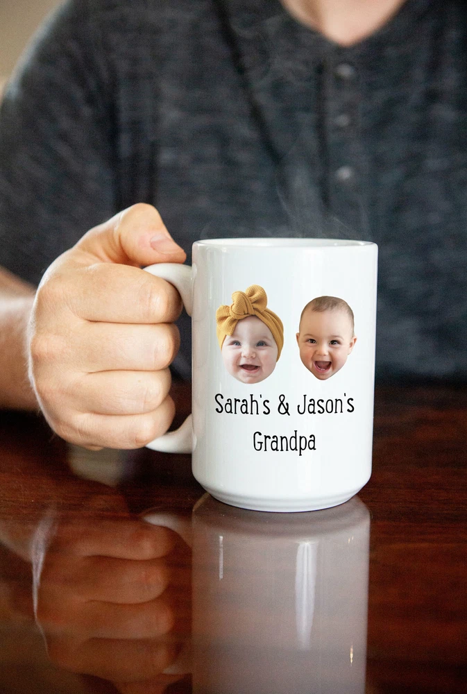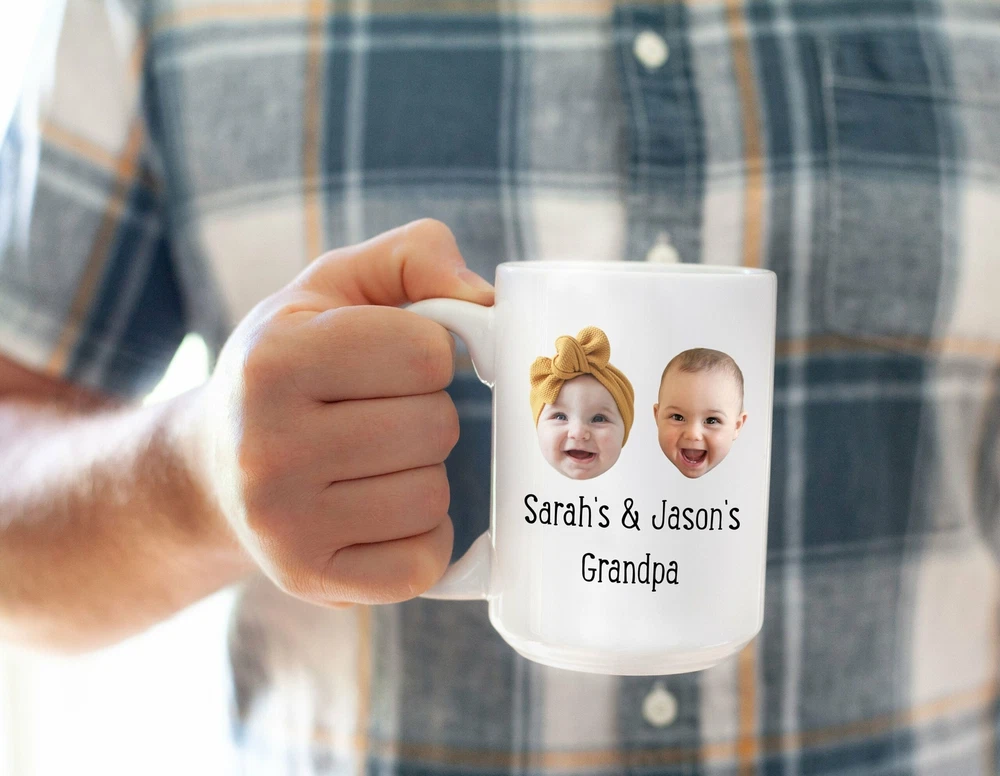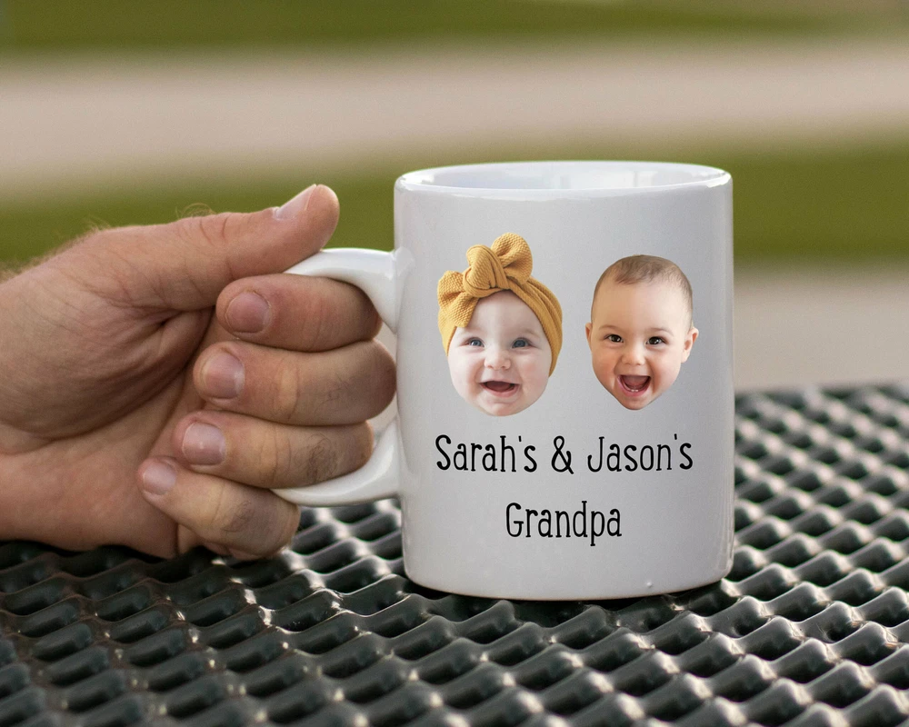 Personalized Gift For Grandpa Custom Grandpa Mug Grandkid Face Mug Baby Photo Product Details.. This high quality 11oz. ceramic white mug has a premium hard coat that provides crisp and vibrant color reproduction sure to last for years. Perfect for all hot & cold beverages. The highest quality printing possible is used. It will never fade no matter how many times you wash it. Material: 100% Ceramic. Print both sides. Dishwasher and Microwave Safe. High Gloss + Premium White Finish. Printed in the U.S.A. Personalized & Custom. We support personalized and custom mug to add custom, when placing an order, you can add notes to the "order note" in shipping address section. Also you can contact us directly via message. Shipping Info. Ready to ship in 1 to 2 business days, All products are made-to-order and proudly printed in the United States. Shipped by USPS and DHL, You will receive your order in 5-7 days. Replace & Refund. All products are defective during shipping broken, chipped will be replaced free of charge. You are not satisfied with the product, we will refund 100% money to you. If any other issues arise, please do not hesitate to message, we would be more than happy to assist you.