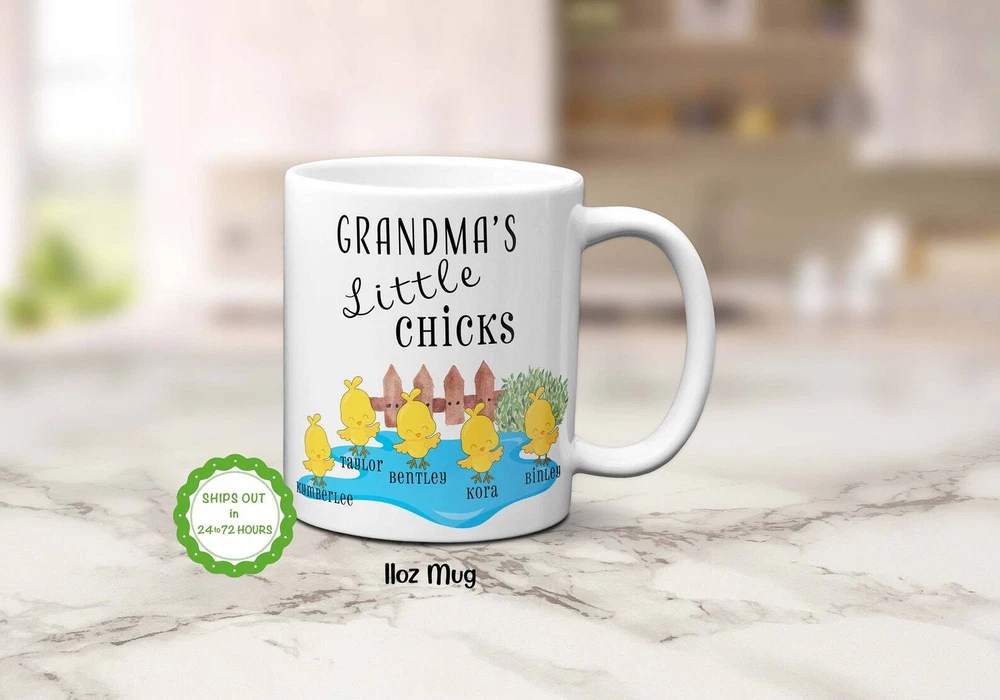 Personalized Grandma Mug Chick Mug Grandma Custom Gift Product Details.. This high quality 11oz. ceramic white mug has a premium hard coat that provides crisp and vibrant color reproduction sure to last for years. Perfect for all hot & cold beverages. The highest quality printing possible is used. It will never fade no matter how many times you wash it. Material: 100% Ceramic. Print both sides. Dishwasher and Microwave Safe. High Gloss + Premium White Finish. Printed in the U.S.A. Personalized & Custom. We support personalized and custom mug to add custom, when placing an order, you can add notes to the "order note" in shipping address section. Also you can contact us directly via message. Shipping Info. Ready to ship in 1 to 2 business days, All products are made-to-order and proudly printed in the United States. Shipped by USPS and DHL, You will receive your order in 5-7 days. Replace & Refund. All products are defective during shipping broken, chipped will be replaced free of charge. You are not satisfied with the product, we will refund 100% money to you. If any other issues arise, please do not hesitate to message, we would be more than happy to assist you.
