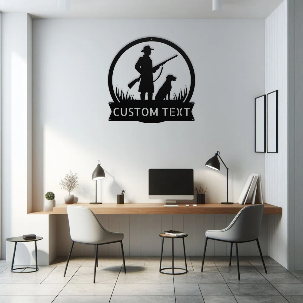 Product Description Personalized Hunter Dog Metal Sign Custom Wall Art Decor Gift for Outdoorsmen Showcase your love for the great outdoors with our Personalized Hunter and Dog Metal Sign ! This custom wall art decor is perfect for outdoorsmen, adding a unique touch to your home, cabin, or office. Made from high-quality 16-gauge metal, this sign is designed with a durable powder coating that protects it from dust, weather, and water, making it suitable for both indoor and outdoor use. Looking for a thoughtful gift? This personalized metal sign makes a fantastic choice for Christmas, birthdays, or any special occasion. It’s a wonderful way to celebrate the bond between hunters and their loyal companions. Key Features: Customizable Design : Personalize the sign with your name or a special message. Durable Material : Crafted from 16-gauge high-quality metal for lasting beauty. Weather-Resistant : Powder-coated finish ensures protection against dust, rain, and rust. Versatile Decor : Ideal for both indoor and outdoor display. Great Gift Idea : A unique present for any hunting enthusiast or dog lover. Celebrate your passion for hunting or surprise a friend with this striking metal sign. Order yours today and add a personal touch to your decor! Service and Color Choice Our metal signs are designed to be personalized just for you, making them the perfect addition to any space! The default color for our signs is Black , but we also offer a variety of beautiful options including Copper, Gold, White, and Silver . After placing your order, simply contact us with your preferred color choice, and we'll ensure your sign is exactly how you envision it. Let’s create something special together!