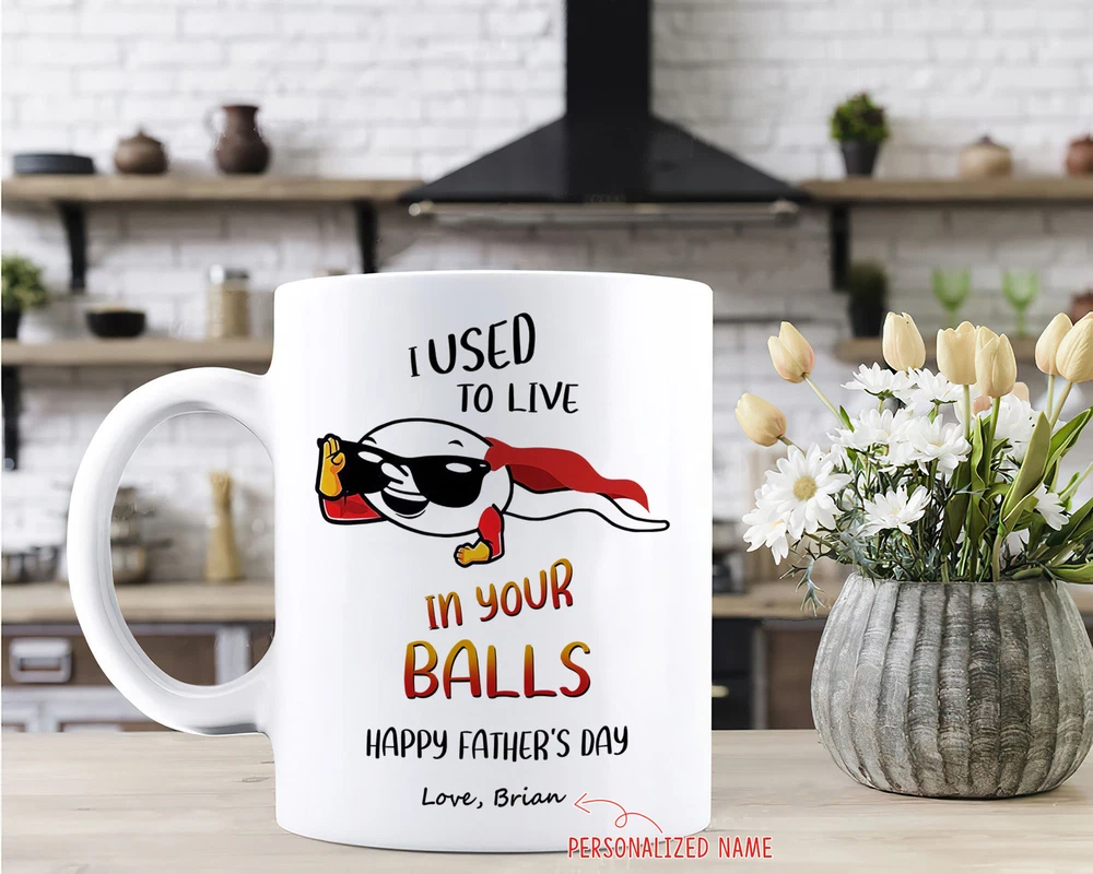 Personalized I Used To Live In Your Balls Mug Mug For Father Mug For Dad From Product Details.. This high quality 11oz. ceramic white mug has a premium hard coat that provides crisp and vibrant color reproduction sure to last for years. Perfect for all hot & cold beverages. The highest quality printing possible is used. It will never fade no matter how many times you wash it. Material: 100% Ceramic. Print both sides. Dishwasher and Microwave Safe. High Gloss + Premium White Finish. Printed in the U.S.A. Personalized & Custom. We support personalized and custom mug to add custom, when placing an order, you can add notes to the "order note" in shipping address section. Also you can contact us directly via message. Shipping Info. Ready to ship in 1 to 2 business days, All products are made-to-order and proudly printed in the United States. Shipped by USPS and DHL, You will receive your order in 5-7 days. Replace & Refund. All products are defective during shipping broken, chipped will be replaced free of charge. You are not satisfied with the product, we will refund 100% money to you. If any other issues arise, please do not hesitate to message, we would be more than happy to assist you.
