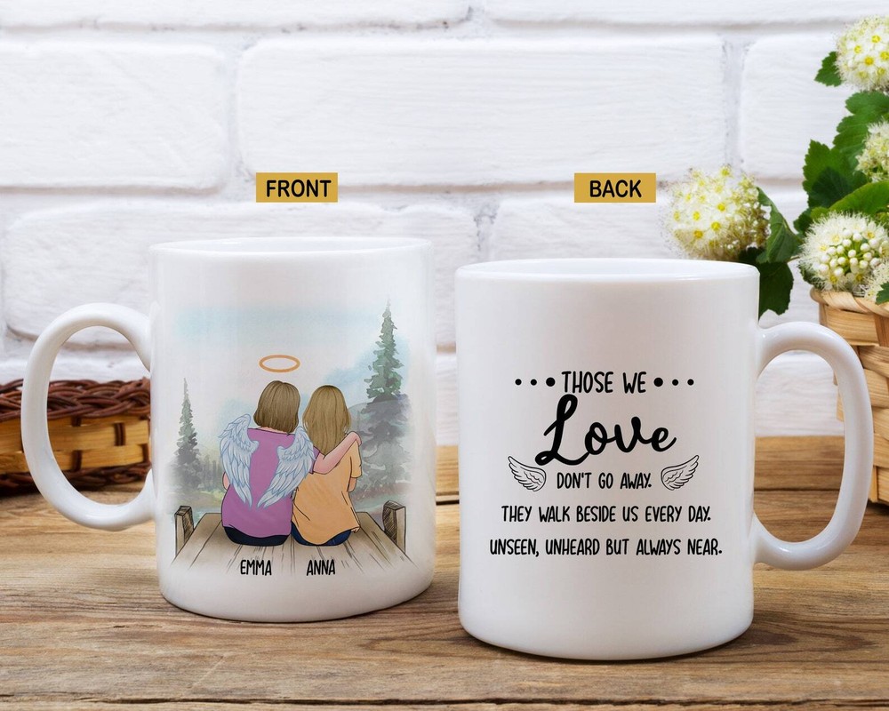 Personalized Memorial Mug Those We Love Don't Go Away Mother Daughter Mug Product Details.. This high quality 11oz. ceramic white mug has a premium hard coat that provides crisp and vibrant color reproduction sure to last for years. Perfect for all hot & cold beverages. The highest quality printing possible is used. It will never fade no matter how many times you wash it. Material: 100% Ceramic. Print both sides. Dishwasher and Microwave Safe. High Gloss + Premium White Finish. Printed in the U.S.A. Personalized & Custom. We support personalized and custom mug to add custom, when placing an order, you can add notes to the "order note" in shipping address section. Also you can contact us directly via message. Shipping Info. Ready to ship in 1 to 2 business days, All products are made-to-order and proudly printed in the United States. Shipped by USPS and DHL, You will receive your order in 5-7 days. Replace & Refund. All products are defective during shipping broken, chipped will be replaced free of charge. You are not satisfied with the product, we will refund 100% money to you. If any other issues arise, please do not hesitate to message, we would be more than happy to assist you.