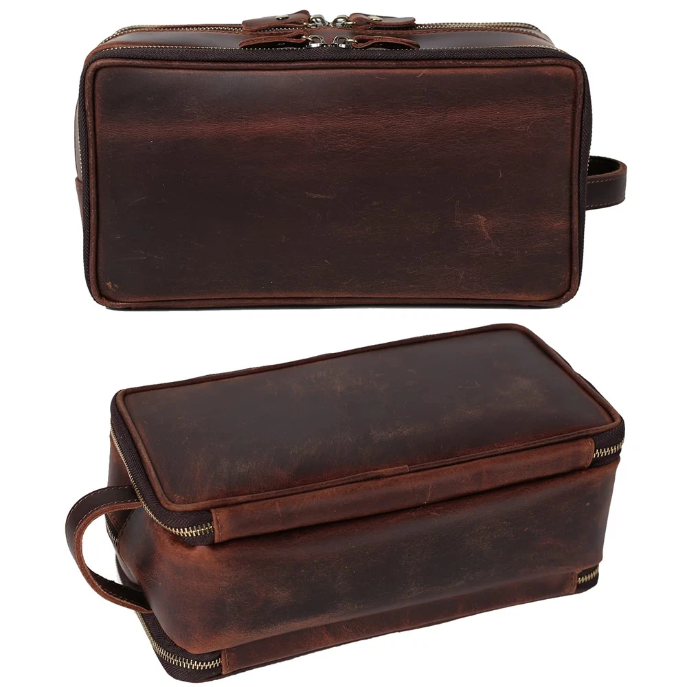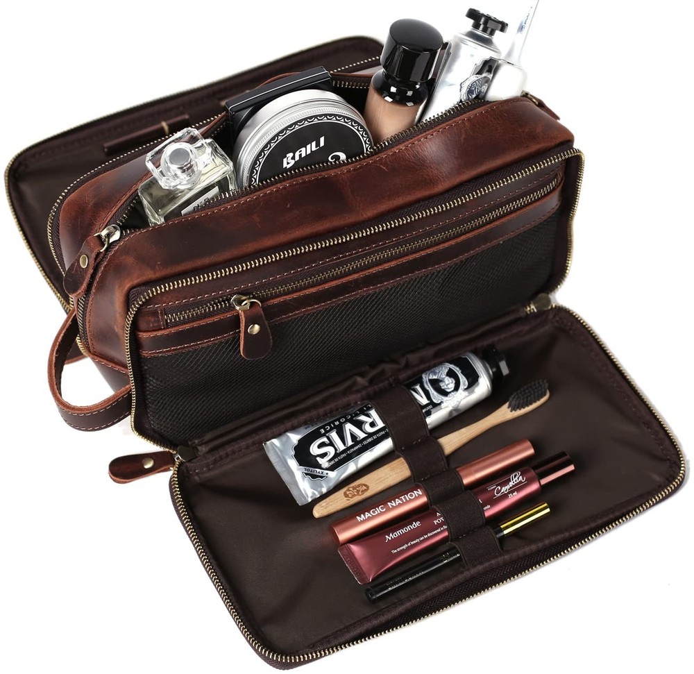 Personalized Leather Travel Toiletry Bag ➤MATERIAL: Travel toiletry bag is made of Genuine Full Grain Leather, water-resistant nylon lining to keep moisture out of the bag. Premium zipper and reinforced seams are also implemented for long-lasting performance. ➤WATERPROOF: 3 separate compartments with Water-resistant thick lining to separates the dry and wet item. ➤LARGE CAPACITY: Size L:12" x 6.7" x 7.1"(L*W*H) ------ Size M: 9.85" x 4" x 5.7"(L*W*H).Multiple pockets inside, which can contain most of your toiletry necessaries orderly in the bag. It can pack your makeup, skin care products, travel sized shampoo, conditioner, body wash, tooth paste, mouth wash, etc. ➤3 ZIPPERS: This travel dopp kit features a unique 3 pockets design, 2 side zipper pocket for makeup brushes or razor etc. with other inner small pocket or mesh pocket for small accessories. well-padded design to keep full bag's shape and provide great protection. ➤Best Gift: Convenient and easy-to-carry. Which makes it a great choice for business trips, travel, gym, camping, home use and more. It would be also a great gift for women and men, a long lasting gift