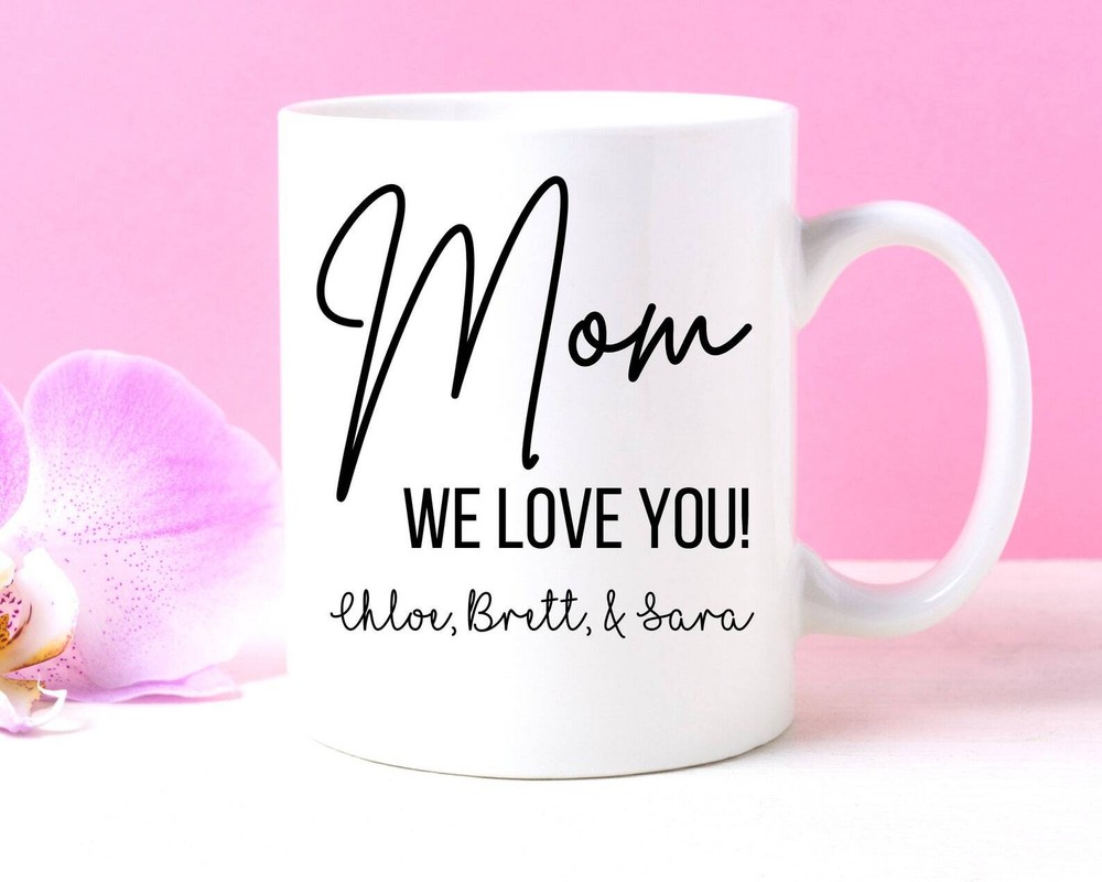 Mom We Love You Mug Mom Mug With Kids Names Personalized Mom Mug Mothers Day Product Details.. This high quality 11oz. ceramic white mug has a premium hard coat that provides crisp and vibrant color reproduction sure to last for years. Perfect for all hot & cold beverages. The highest quality printing possible is used. It will never fade no matter how many times you wash it. Material: 100% Ceramic. Print both sides. Dishwasher and Microwave Safe. High Gloss + Premium White Finish. Printed in the U.S.A. Personalized & Custom. We support personalized and custom mug to add custom, when placing an order, you can add notes to the "order note" in shipping address section. Also you can contact us directly via message. Shipping Info. Ready to ship in 1 to 2 business days, All products are made-to-order and proudly printed in the United States. Shipped by USPS and DHL, You will receive your order in 5-7 days. Replace & Refund. All products are defective during shipping broken, chipped will be replaced free of charge. You are not satisfied with the product, we will refund 100% money to you. If any other issues arise, please do not hesitate to message, we would be more than happy to assist you.