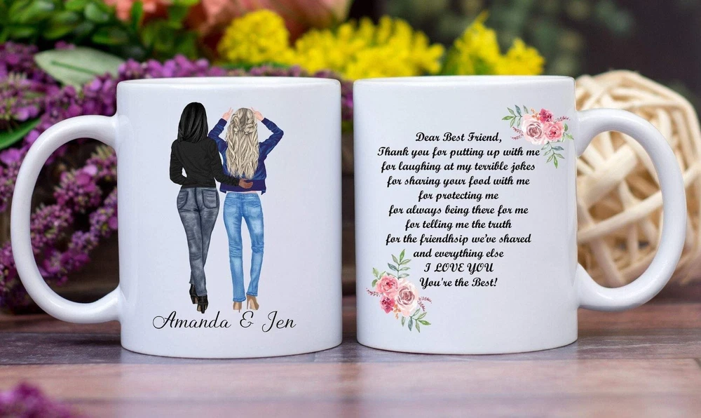 Personalized Mug For Best Friend Custom Best Friend Mug Personalized Coffee Mug Product Details.. This high quality 11oz. ceramic white mug has a premium hard coat that provides crisp and vibrant color reproduction sure to last for years. Perfect for all hot & cold beverages. The highest quality printing possible is used. It will never fade no matter how many times you wash it. Material: 100% Ceramic. Print both sides. Dishwasher and Microwave Safe. High Gloss + Premium White Finish. Printed in the U.S.A. Personalized & Custom. We support personalized and custom mug to add custom, when placing an order, you can add notes to the "order note" in shipping address section. Also you can contact us directly via message. Shipping Info. Ready to ship in 1 to 2 business days, All products are made-to-order and proudly printed in the United States. Shipped by USPS and DHL, You will receive your order in 5-7 days. Replace & Refund. All products are defective during shipping broken, chipped will be replaced free of charge. You are not satisfied with the product, we will refund 100% money to you. If any other issues arise, please do not hesitate to message, we would be more than happy to assist you.