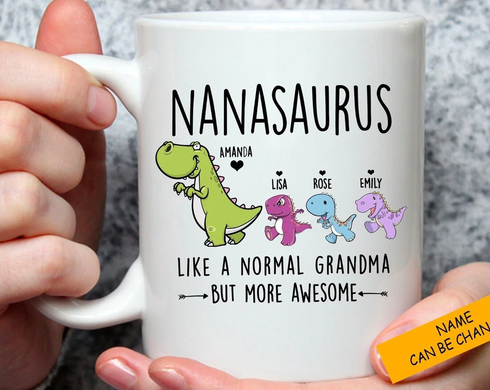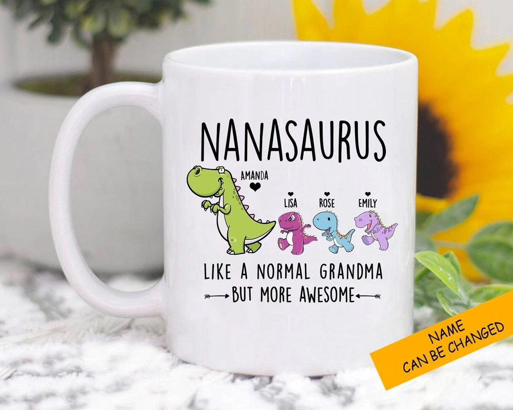 Personalized Nanasaurus Mug Custom Grandmasaurus Mug Mother's Day Mug Mug Product Details.. This high quality 11oz. ceramic white mug has a premium hard coat that provides crisp and vibrant color reproduction sure to last for years. Perfect for all hot & cold beverages. The highest quality printing possible is used. It will never fade no matter how many times you wash it. Material: 100% Ceramic. Print both sides. Dishwasher and Microwave Safe. High Gloss + Premium White Finish. Printed in the U.S.A. Personalized & Custom. We support personalized and custom mug to add custom, when placing an order, you can add notes to the "order note" in shipping address section. Also you can contact us directly via message. Shipping Info. Ready to ship in 1 to 2 business days, All products are made-to-order and proudly printed in the United States. Shipped by USPS and DHL, You will receive your order in 5-7 days. Replace & Refund. All products are defective during shipping broken, chipped will be replaced free of charge. You are not satisfied with the product, we will refund 100% money to you. If any other issues arise, please do not hesitate to message, we would be more than happy to assist you.
