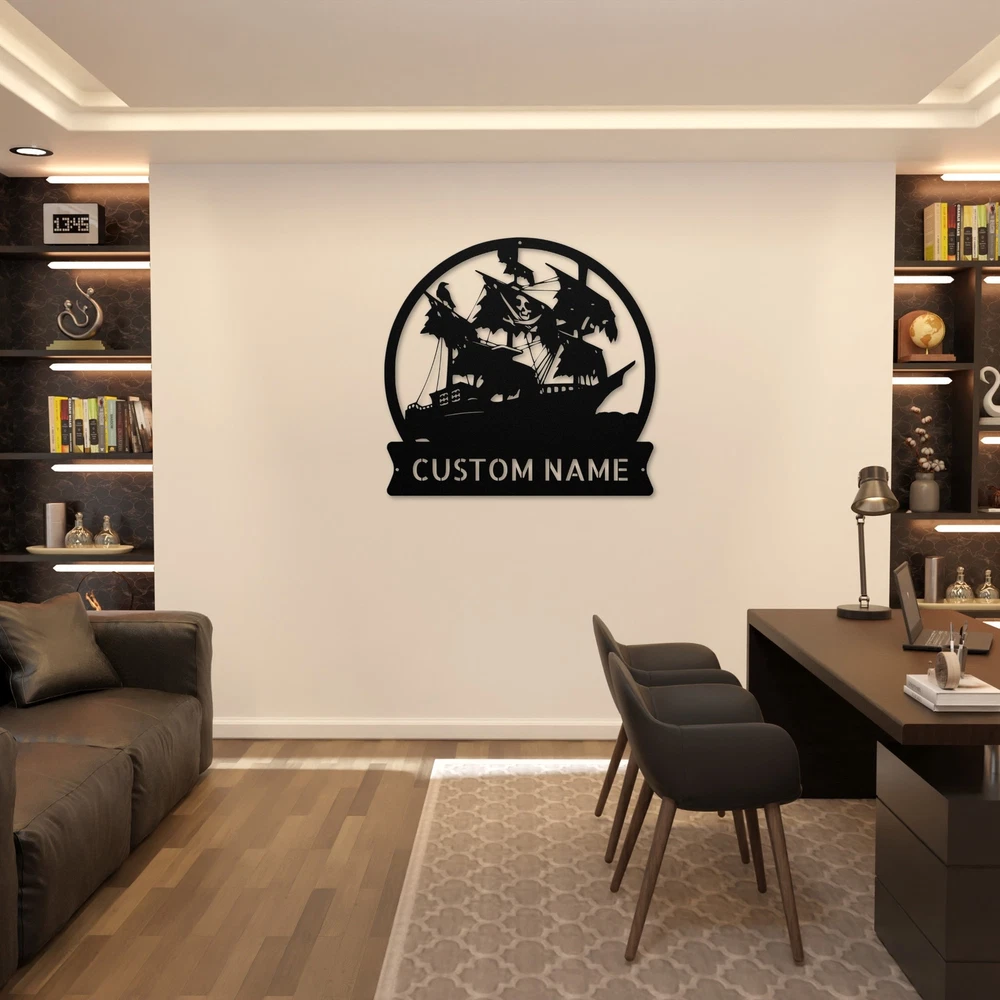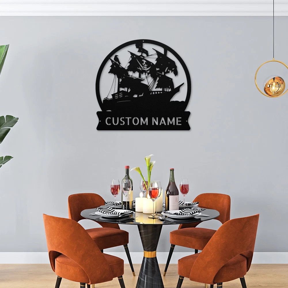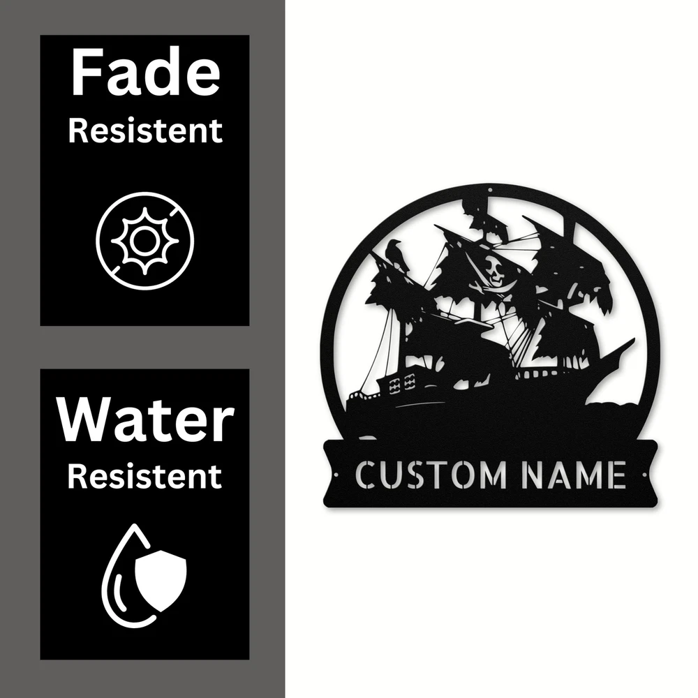 Product Description Personalized Pirate Ship Metal Sign Custom Nautical Decor Gift for Home Office Set sail on a new adventure with the Personalized Pirate Ship Metal Sign . This eye-catching sign is perfect for anyone who loves the sea and pirate lore. It makes a fantastic addition to your home, office, or as a unique gift for a special occasion. Crafted from 16 gauge high-quality metal , this sign is built to last. The powder coating ensures it is dust, weather, and water-resistant, so you can proudly display it indoors or outdoors without worry. Key features include: Customizable Design: Add your name or a special message to make this sign truly one-of-a-kind. Durable Material: Made from sturdy metal for long-lasting beauty and resilience against the elements. Perfect Gift: An ideal present for birthdays, holidays, or any pirate enthusiast in your life. Stylish Decoration: Enhances any space with its nautical charm, suitable for home, office, or nautical-themed events. Bring a touch of the high seas to your decor with the Personalized Pirate Ship Metal Sign . It’s more than just decoration; it’s a celebration of adventure and individuality! Service and Color Choice Our metal signs are designed to be personalized just for you, making them the perfect addition to any space! The default color for our signs is Black , but we also offer a variety of beautiful options including Copper, Gold, White, and Silver . After placing your order, simply contact us with your preferred color choice, and we'll ensure your sign is exactly how you envision it. Let’s create something special together!