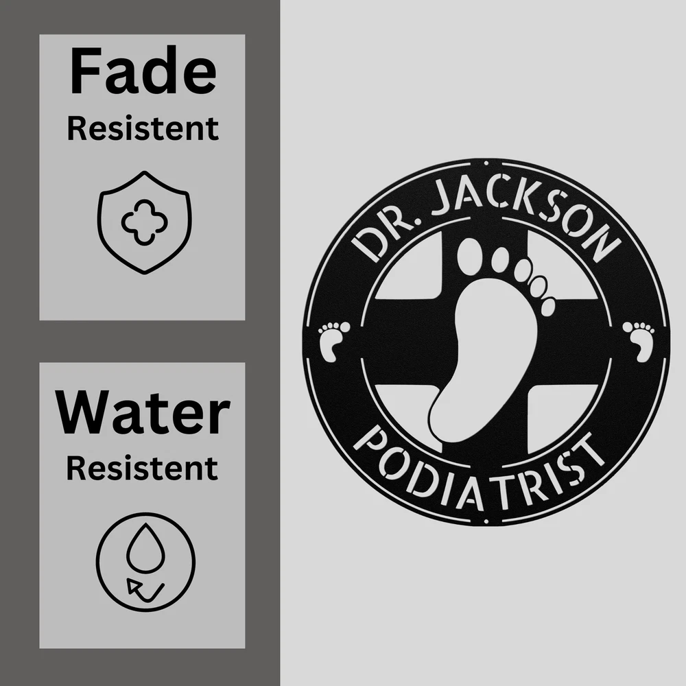 Product Description Personalized Podiatry Metal Sign Office Decor Unique Gift for Foot Care Experts Elevate your podiatry practice or home office with the Custom Podiatry Metal Sign . Made from durable 16 gauge high-quality metal, this personalized sign is a stylish and professional addition to any space. The powder-coated finish ensures that it is dust, weather, and water-resistant, making it suitable for both indoor and outdoor use. Whether you’re looking to add a professional touch to your podiatry clinic or simply want to show off your profession at home, this sign makes a lasting impression. This Custom Podiatry Metal Sign also makes for a thoughtful and unique gift for Christmas, birthdays, or any special occasion. Perfect for podiatrists, foot care specialists, or anyone who appreciates personalized decor. Key Features: Personalized Design: Add a name, business title, or message to make it uniquely yours. 16 Gauge High-Quality Metal: Built to last, this sturdy metal sign is perfect for long-term display. Powder Coated Finish: Resistant to dust, weather, and water, ideal for indoor or outdoor use. Great for Podiatry Offices or Home Decor: Professional yet personalized, perfect for a clinic or home office. Thoughtful Gift Idea: Ideal for podiatrists, making it a memorable gift for birthdays, Christmas, or other special occasions. Enhance your space with the Custom Podiatry Metal Sign , a personalized and professional decoration that showcases your passion for foot care! Service and Color Choice Our metal signs are designed to be personalized just for you, making them the perfect addition to any space! The default color for our signs is Black , but we also offer a variety of beautiful options including Copper, Gold, White, and Silver . After placing your order, simply contact us with your preferred color choice, and we'll ensure your sign is exactly how you envision it. Let’s create something special together!