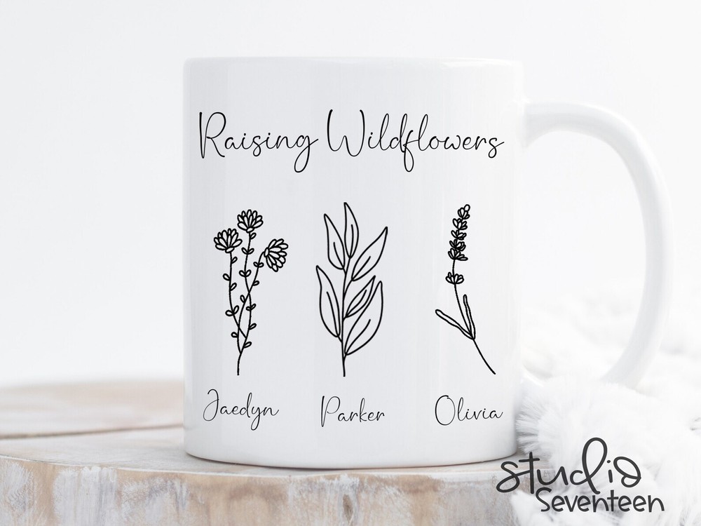 Raising Wildflowers Mom Mug Personalized Mom Mug With Children's Names First Product Details.. This high quality 11oz. ceramic white mug has a premium hard coat that provides crisp and vibrant color reproduction sure to last for years. Perfect for all hot & cold beverages. The highest quality printing possible is used. It will never fade no matter how many times you wash it. Material: 100% Ceramic. Print both sides. Dishwasher and Microwave Safe. High Gloss + Premium White Finish. Printed in the U.S.A. Personalized & Custom. We support personalized and custom mug to add custom, when placing an order, you can add notes to the "order note" in shipping address section. Also you can contact us directly via message. Shipping Info. Ready to ship in 1 to 2 business days, All products are made-to-order and proudly printed in the United States. Shipped by USPS and DHL, You will receive your order in 5-7 days. Replace & Refund. All products are defective during shipping broken, chipped will be replaced free of charge. You are not satisfied with the product, we will refund 100% money to you. If any other issues arise, please do not hesitate to message, we would be more than happy to assist you.