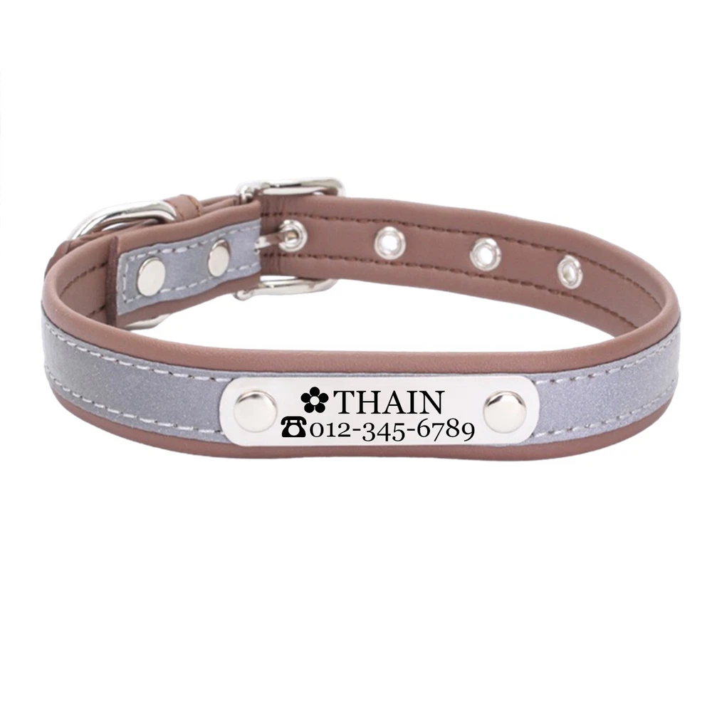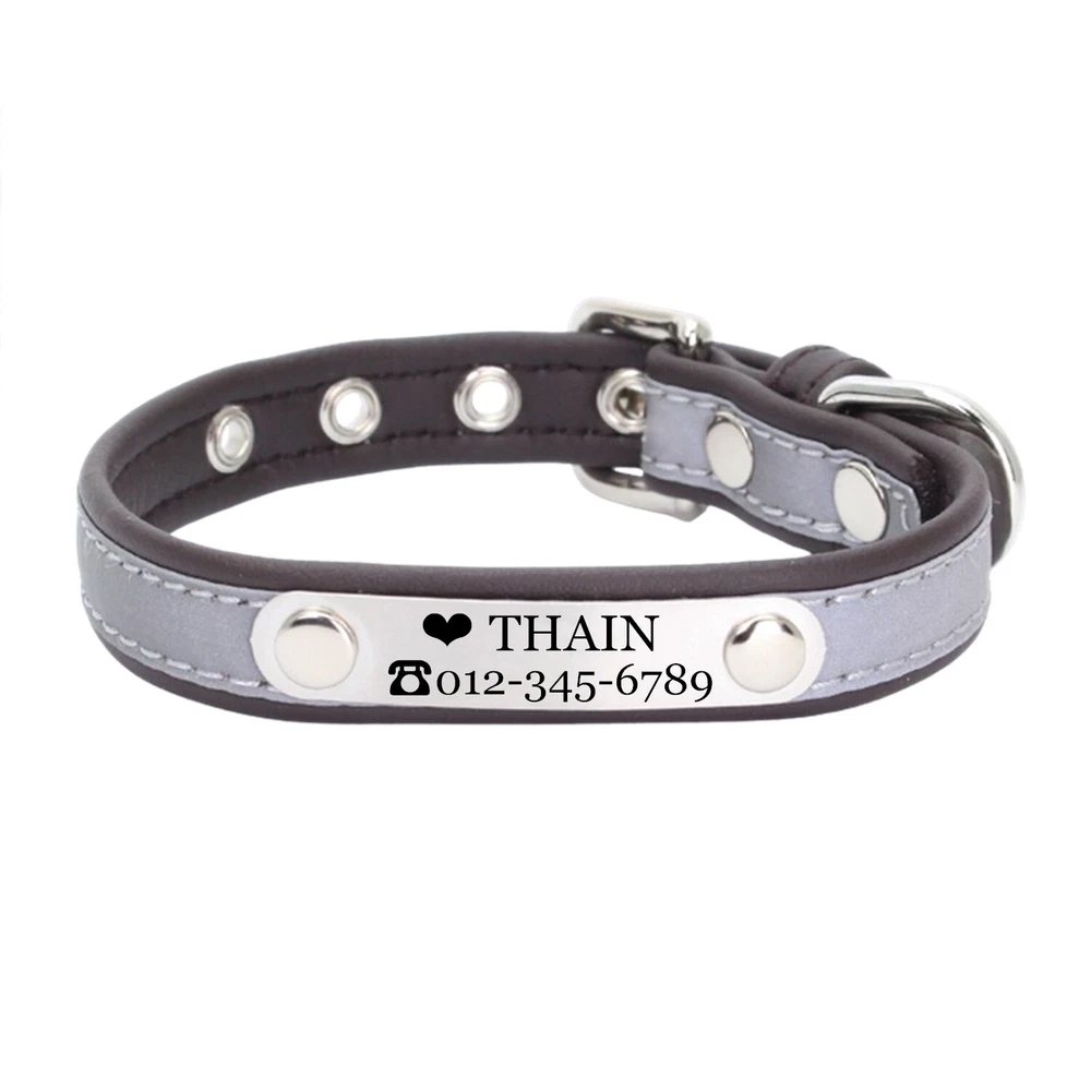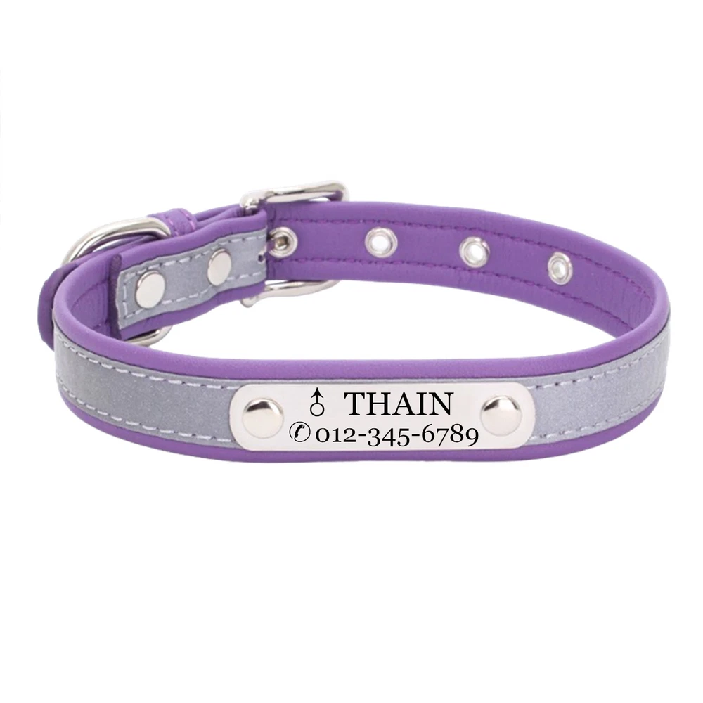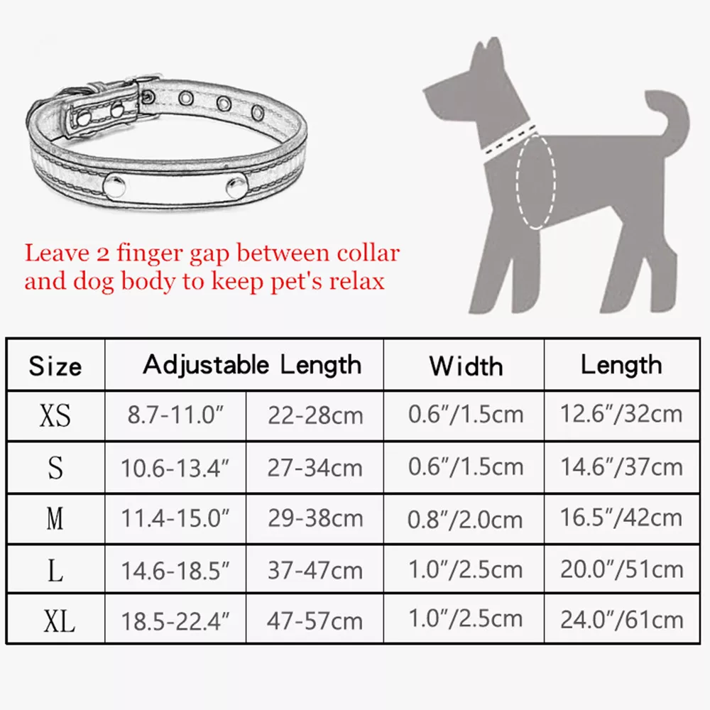 Product Name: THAIN Personalized Reflective Cat Dog Collar with Name Plate Custom Engraved Cute Puppy Kitten Dog Cat Collars for Male Female Boy Girl Small Medium Large Dogs Material: M icrofiber+Metal Buckle Size: XXS/S/M/L/XL(See the measurement on the size picture) Font used: Arial or Georgia How to Order Please write engraving details in box at the top of listing page. Product Features: ★ 【 Material H igh-grade microfiber material, softer and more comfortable than PU leather collars, Perfectly solves the problem of nylon collar trapped hair . ★ 【 Reflective 】 High brightness reflective strip, Under the light in the dark environment, the collar will emit more reflective effects. making it easier for people to see your pets. please not the collar does not emit light by itself. ★ 【 Metal Buckle and D-Ring 】 Buckle and D-ring are made of alloy metal with rounded corners, sturdy and rust-free. You can also add dog tags, rabies tags, or other tags to the D-ring. ★ 【 Available in 5 Sizes】 X-Small: 0.6"x(8.7-11"), Small: 0.6"x(10.6-13.4"), Medium: 0.8"x(11.4-15"), Large: 1.0"x(14.6-18.5"), X-Large: 1.0"x(18.5-22.4"). Please measure your pet's neck and choose the right size before purchasing(please leave two fingers room to keep pet's relax) Metal Nameplate where we will engrave the pet's name and phone number or address Laser engraving makes words are clear, keeps pet's information engraved permanent. This dog collar fits for many kinds of dogs, like Poodle, Pugs, Dachshund, Terrier, Beagle, Pitbull, Labrador, Bulldog and so on. Note: For engraved words,please send us a message as below: Line 1: pet's name ( you can add one symbol ★ ♂ ✿ ❤ ♛ ) Line 2: phone number (you can add one symbol ☎ ✆ ) Smaple: Line 1: ❤ Bella Line 2: ☎ 012-345-6789 How to choose the right size? Measurement Tips: Please use a soft ruler around your Cat's neck, to measure the surrounding of it. Please don't make it too tight. Better leave a space that can put 2 fingers. So your puppy may feel more comfortable. Size Width Neck Adjustable Weight XS 0.6"(1.5cm) 8.7-11"(22-28cm) 30g S 0.6"(1.5cm) 10.6-13.4"(27-34cm) 32g M 0.8"(2.0cm) 11.4-15"(29-38cm) 42g L 1.0"(2.5cm) 14.6-18.5"(37-47cm) 60g XL 1.0"(2.5cm) 18.5-22.4"(47-57cm) 70g Package include: 1 pcs pet collar Shipping: 1.Items will be sent out in 24-48 hours on payment received from Monday to Saturday. Orders during weekends and holidays will be posted in the following working day. 2.it usually will take 15-20 business days to arrive by SPEEDPAK. 3.Please make sure your shipping address and the order information is correct before placing an order. We will not be responsible for item loss due to wrong or unknown address. 4.International buyers are responsible for duties and customs fees. Return Policy & Warranty: 1. In our store, you will enjoy 30 days return/refund guarantee (Excluding misuse of the item and damaged item). 2. If the item you received is faulty, damaged or incorrect, or any further problems, you can return it for replacement or refund, please contact our customer service on eBay within 30 days from item received. 3.For damaged items on arrival, please contact us immediately, sending us an email with a photo is preferred. We will offer solutions to such cases. Full refund or replacement will be guaranteed. Contact us: Customer satisfaction is very important to us, our goal is to earn 5 star positive feedback on every sale! We would appreciate the chance to correct any problems before posting anything other than 5 stars positive feedback. So if for ANY reason you are not happy, please contact us directly through “My Massage” or "Ask Seller Q". We will get back to you as soon as we are available. We are always stand-by to help for any questions or concerns.