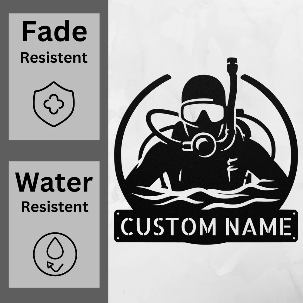 Product Description Personalized Scuba Diver Metal Sign Custom Diving Decor Gift for Ocean Lovers Dive into style with our Personalized Scuba Diver Metal Sign ! Perfect for ocean enthusiasts and divers, this sign brings the beauty of the underwater world right to your space. Made from 16 gauge high-quality metal , this sign is built to last. The powder coating ensures it is dust, weather, and water-resistant , making it ideal for both indoor and outdoor use. Key features include: Customizable Design: Add your name or a special message to make it uniquely yours. Durable Construction: Sturdy enough to withstand the elements while maintaining its stunning look. Great Gift Idea: A fantastic choice for Christmas, birthdays, or any special occasion for those who love the ocean. Charming Decor: Perfect for your home, office, or diving retreat, showcasing your passion for scuba diving. Celebrate your love for the ocean with the Personalized Scuba Diver Metal Sign . It’s not just a sign; it’s a way to express your adventurous spirit! Service and Color Choice Our metal signs are designed to be personalized just for you, making them the perfect addition to any space! The default color for our signs is Black , but we also offer a variety of beautiful options including Copper, Gold, White, and Silver . After placing your order, simply contact us with your preferred color choice, and we'll ensure your sign is exactly how you envision it. Let’s create something special together!