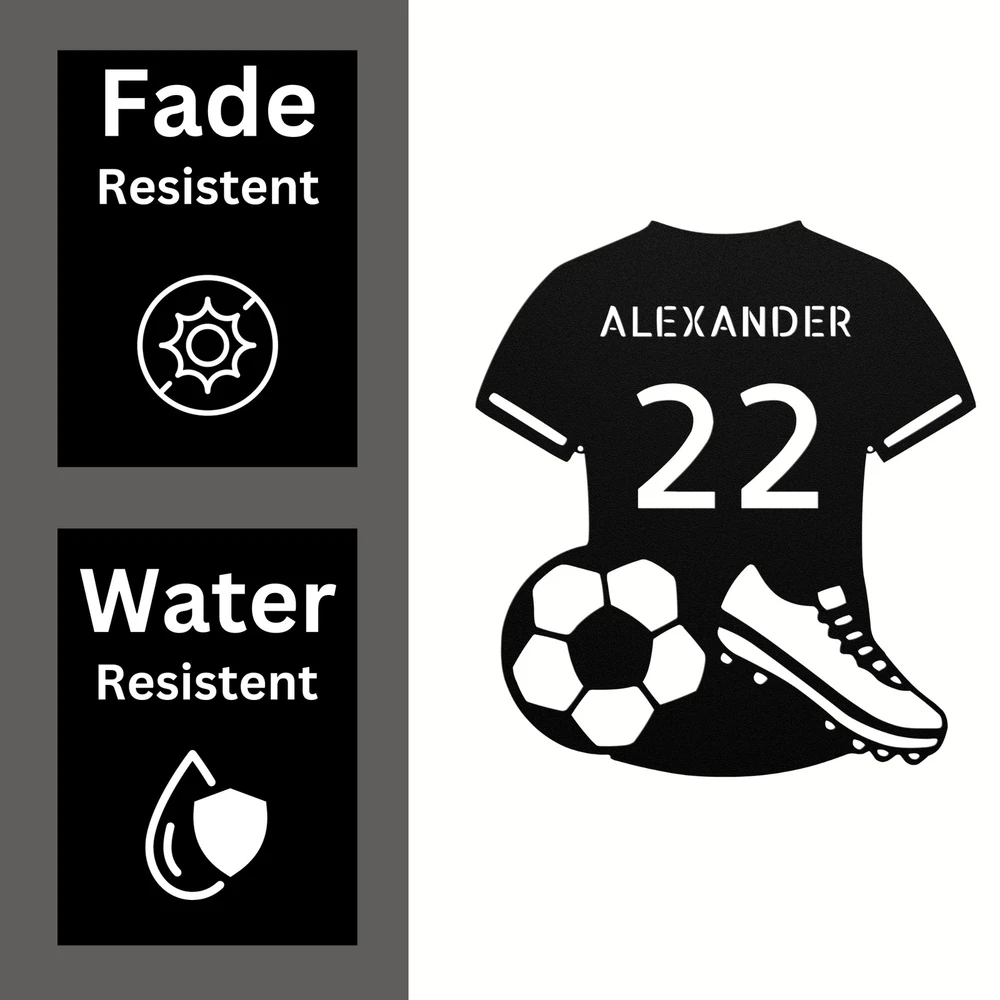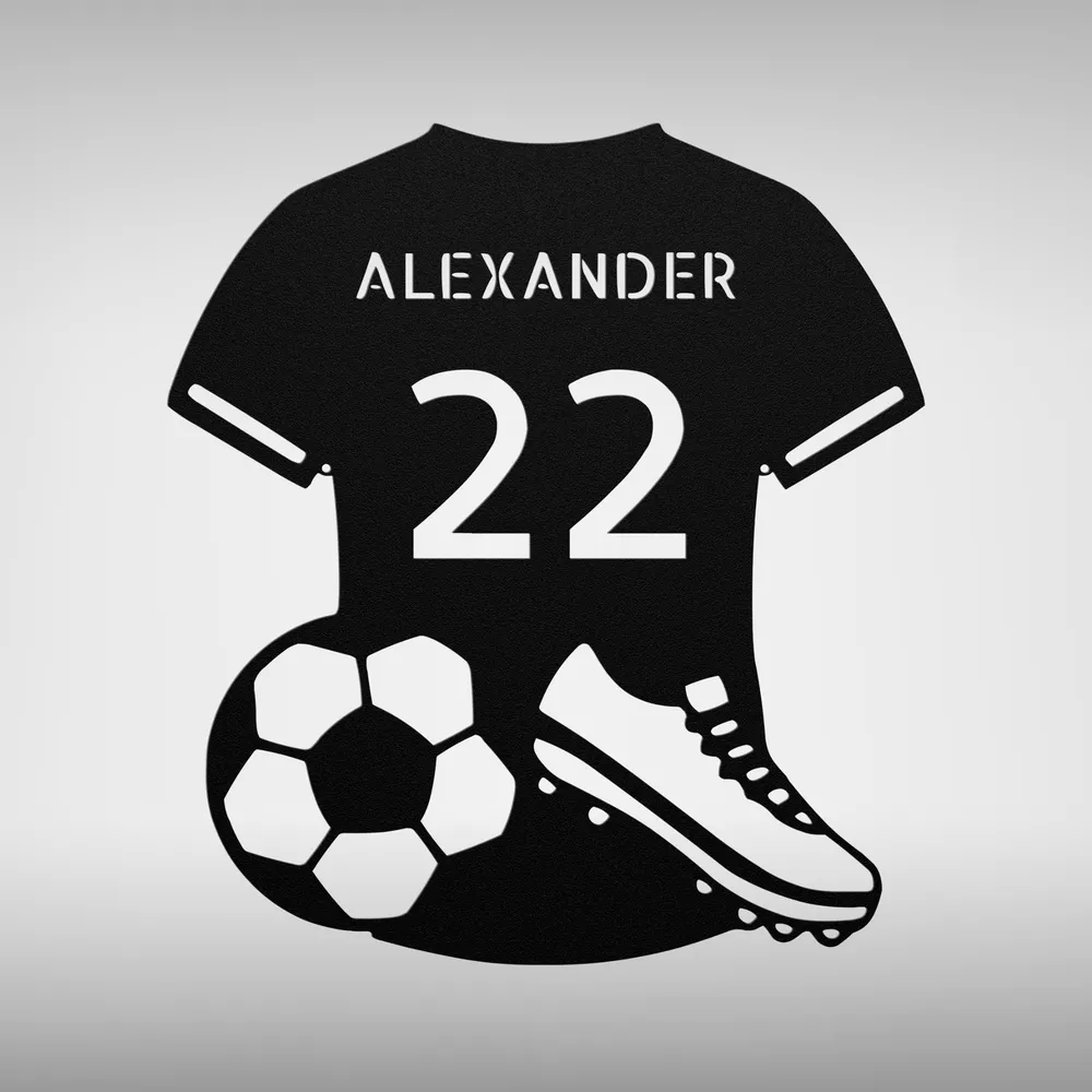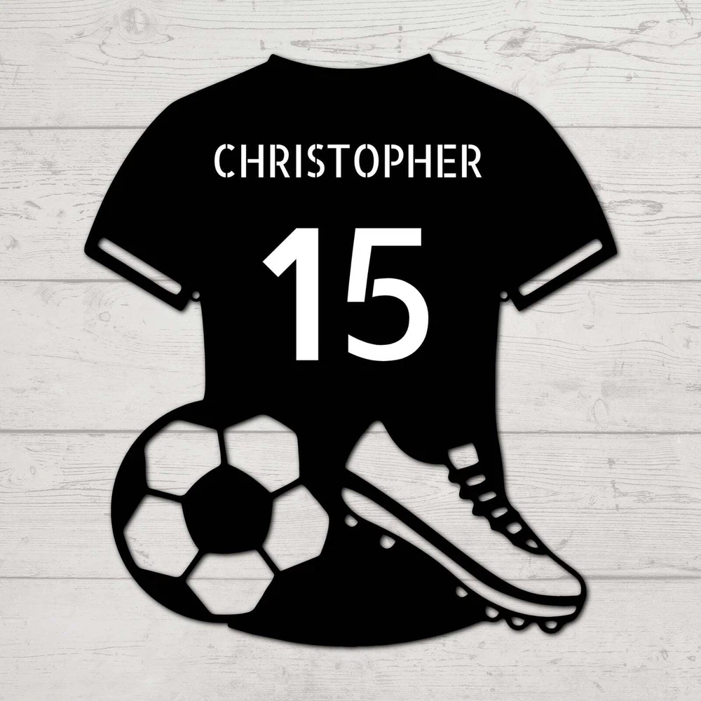 Product Description Personalized Soccer Jersey Metal Sign Custom Sports Decor Gift for Soccer Fans Show your love for the game with the Personalized Soccer Jersey Metal Sign ! This unique sign is perfect for any soccer enthusiast, making it a great addition to your home, office, or sports room. Made from 16 gauge high-quality metal , this sign is designed for durability and style. The powder coating makes it dust, weather, and water-resistant, ensuring it looks great whether displayed indoors or outdoors. Key features include: Customizable Design: Add a name, number, or team to create a one-of-a-kind piece that reflects your passion. Durable Construction: Crafted from sturdy metal for lasting enjoyment and a sleek appearance. Perfect Gift: Ideal for birthdays, Christmas, or any special occasion for soccer lovers of all ages. Versatile Decor: Great for decorating your home, office, or sports area, showcasing your soccer spirit. The Personalized Soccer Jersey Metal Sign is more than just decoration; it’s a celebration of your favorite sport. Personalize yours today and let your soccer pride shine! Service and Color Choice Our metal signs are designed to be personalized just for you, making them the perfect addition to any space! The default color for our signs is Black , but we also offer a variety of beautiful options including Copper, Gold, White, and Silver . After placing your order, simply contact us with your preferred color choice, and we'll ensure your sign is exactly how you envision it. Let’s create something special together!
