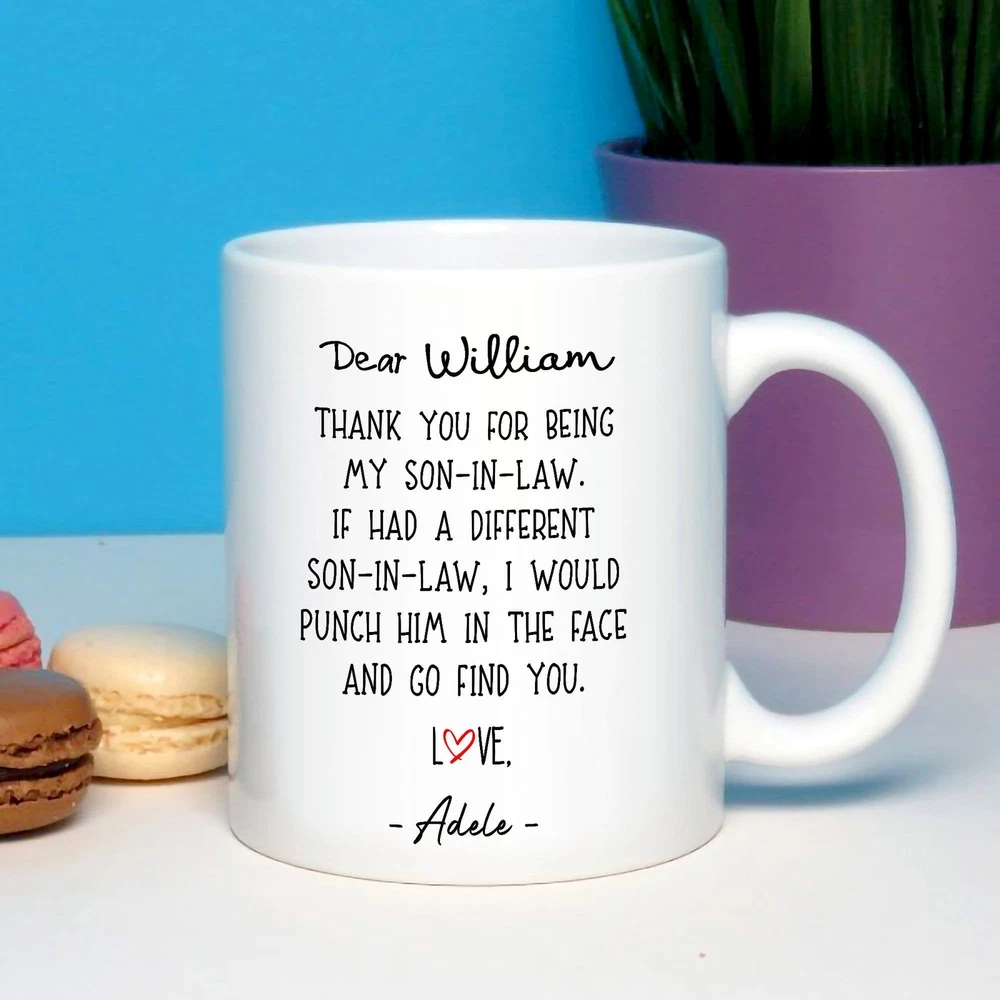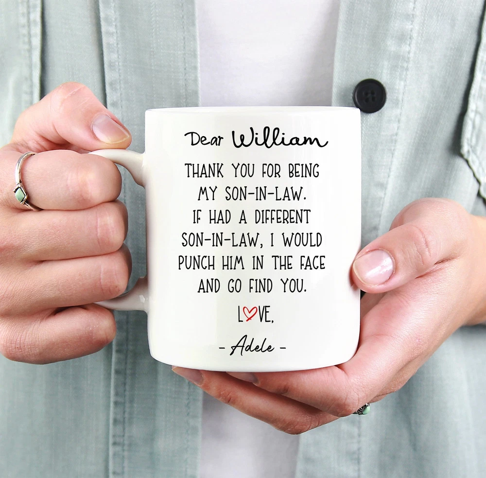 Personalized Son In Law From Mother In Law Mug Mother In Law To Son In Law Mug Product Details.. This high quality 11oz. ceramic white mug has a premium hard coat that provides crisp and vibrant color reproduction sure to last for years. Perfect for all hot & cold beverages. The highest quality printing possible is used. It will never fade no matter how many times you wash it. Material: 100% Ceramic. Print both sides. Dishwasher and Microwave Safe. High Gloss + Premium White Finish. Printed in the U.S.A. Personalized & Custom. We support personalized and custom mug to add custom, when placing an order, you can add notes to the "order note" in shipping address section. Also you can contact us directly via message. Shipping Info. Ready to ship in 1 to 2 business days, All products are made-to-order and proudly printed in the United States. Shipped by USPS and DHL, You will receive your order in 5-7 days. Replace & Refund. All products are defective during shipping broken, chipped will be replaced free of charge. You are not satisfied with the product, we will refund 100% money to you. If any other issues arise, please do not hesitate to message, we would be more than happy to assist you.