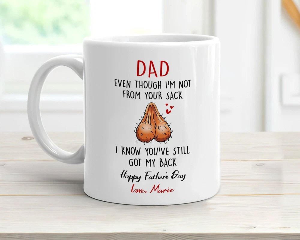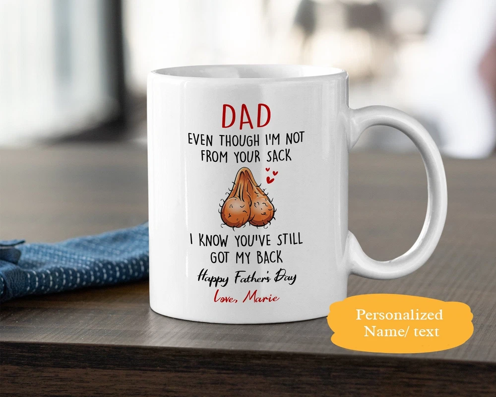 Personalized Stepdad Funny Coffee Mug Even Though I'm Not From Your Sack Mug Product Details.. This high quality 11oz. ceramic white mug has a premium hard coat that provides crisp and vibrant color reproduction sure to last for years. Perfect for all hot & cold beverages. The highest quality printing possible is used. It will never fade no matter how many times you wash it. Material: 100% Ceramic. Print both sides. Dishwasher and Microwave Safe. High Gloss + Premium White Finish. Printed in the U.S.A. Personalized & Custom. We support personalized and custom mug to add custom, when placing an order, you can add notes to the "order note" in shipping address section. Also you can contact us directly via message. Shipping Info. Ready to ship in 1 to 2 business days, All products are made-to-order and proudly printed in the United States. Shipped by USPS and DHL, You will receive your order in 5-7 days. Replace & Refund. All products are defective during shipping broken, chipped will be replaced free of charge. You are not satisfied with the product, we will refund 100% money to you. If any other issues arise, please do not hesitate to message, we would be more than happy to assist you.