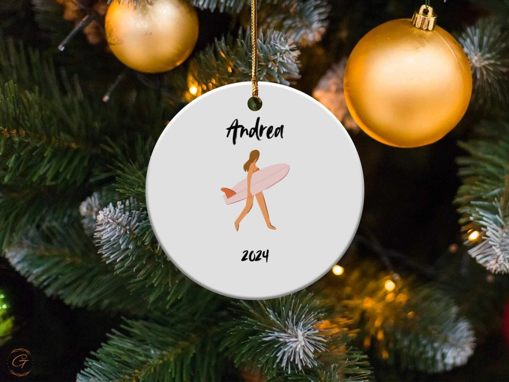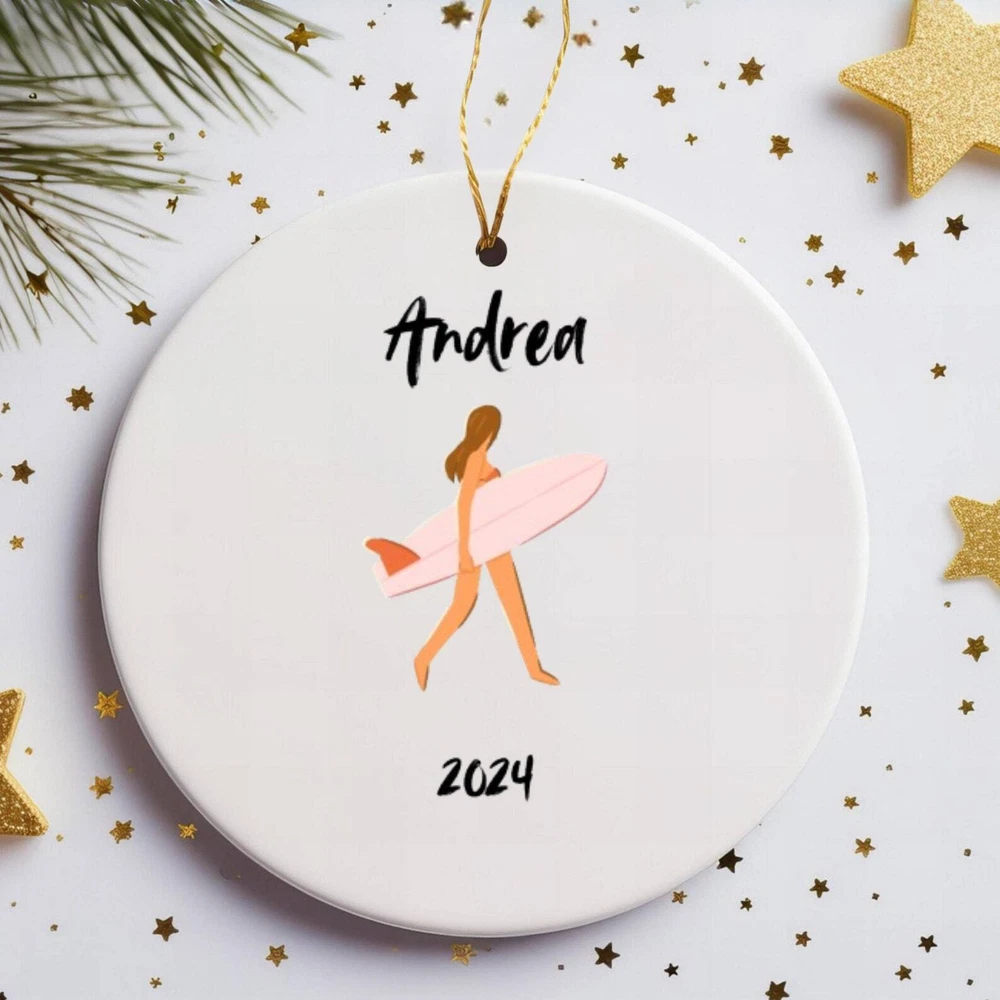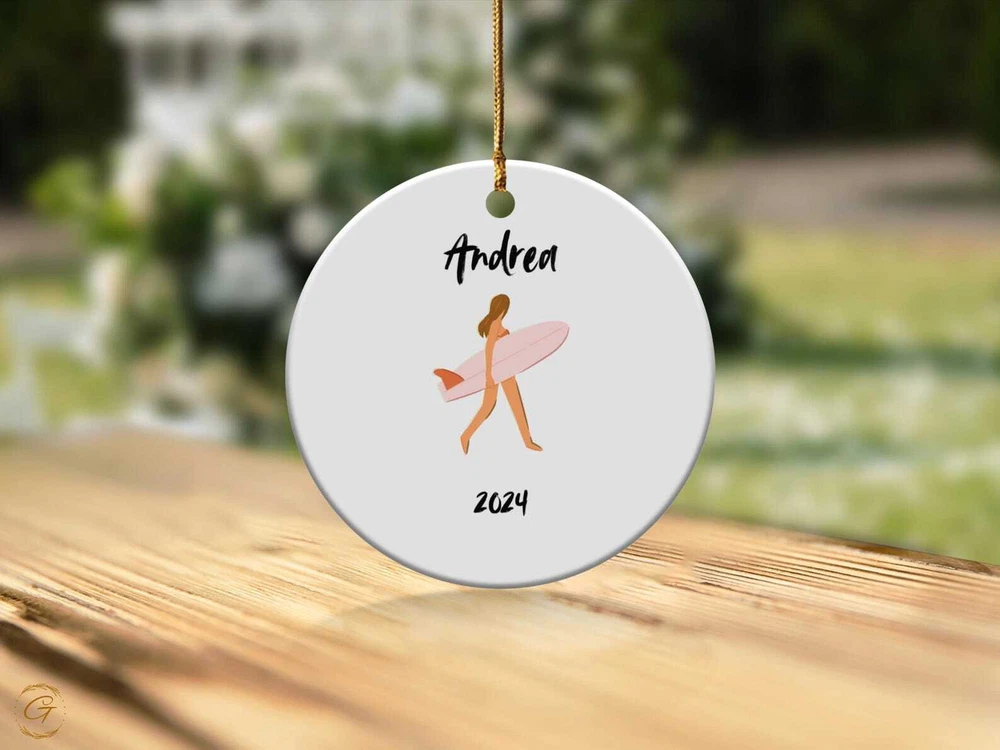 Personalized Surfer Ornament 2024 Beach Lover Ornament Surfing Gift Personalized Christmas Decoration Holiday Tree Ornament Ideal Gifts Material: Ceramic Color: White Shapes: Circle, star, heart and oval Can be printed on both sides Imprint full-color artwork, photos, or logos Hole for hanging string and hanging string included Printed in the USA