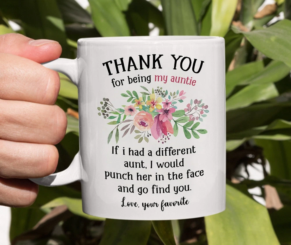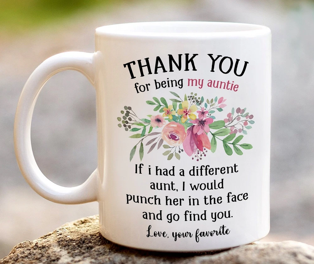 Personalized Thank You For Being My Auntie Mug Aunt Coffee Mug Aunt Gift New Product Details.. This high quality 11oz. ceramic white mug has a premium hard coat that provides crisp and vibrant color reproduction sure to last for years. Perfect for all hot & cold beverages. The highest quality printing possible is used. It will never fade no matter how many times you wash it. Material: 100% Ceramic. Print both sides. Dishwasher and Microwave Safe. High Gloss + Premium White Finish. Printed in the U.S.A. Personalized & Custom. We support personalized and custom mug to add custom, when placing an order, you can add notes to the "order note" in shipping address section. Also you can contact us directly via message. Shipping Info. Ready to ship in 1 to 2 business days, All products are made-to-order and proudly printed in the United States. Shipped by USPS and DHL, You will receive your order in 5-7 days. Replace & Refund. All products are defective during shipping broken, chipped will be replaced free of charge. You are not satisfied with the product, we will refund 100% money to you. If any other issues arise, please do not hesitate to message, we would be more than happy to assist you.