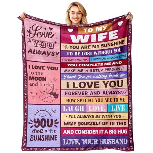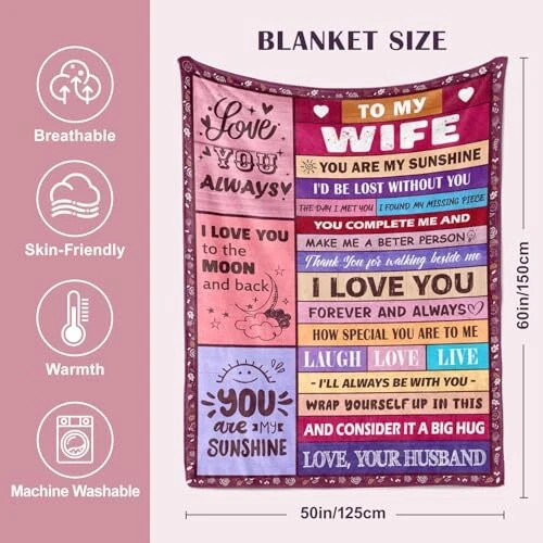 Return Policy Fast Delivery Trusted seller Gifts for Wife TO MY WIFE Blanket Wife Birthday Gift Ideas Wife Gifts from Husband Anniversary Birthday Gifts for Women Wife Blanket Gifts for Mothers Day Christmas Valentines Day Birthday 50"x60" Product Description Thoughtful Gifts for Wife: This "To My Wife" blanket is the perfect way to show your love and appreciation. Ideal as a wife birthday gift, anniversary present, or a special surprise for Mother’s Day and Christmas, it’s a heartfelt gift from a husband to his beloved wife Soft and Luxurious Comfort: Crafted from premium, ultra-soft materials, this blanket provides exceptional warmth and comfort. It’s a thoughtful gift for women that your wife can snuggle up with, feeling cherished and loved every time she uses it Unique and Sentimental Design: Unlike ordinary gifts, this blanket features a special message and unique design that makes it stand out. It’s an ideal wife gift idea, perfect for birthdays, anniversaries, or any occasion w you want to express your love and appreciation Versatile and Practical: Perfect for various settings, whether your mom is relaxing at home, traveling, or using it as a decorative piece in her living room. This blanket is not just a gift, but a versatile item that adds warmth and comfort to her daily life Durable Keepsake: Made with high-quality materials, this blanket is designed to last, becoming a cherished keepsake for your wife. It’s a lasting reminder of your love, making it one of the best gifts for wives from husbands for any special occasion Shipping Returns Payment Shipping Shipping is FREE to all addresses other than APO/PO boxes in the lower 48 states. All our stock ships from US-based warehouses. Shipped via USPS or UPS (depending on location and package weight) Unless stated otherwise, all orders will ship within 24-72 hours of your payment being processed. Check our feedback to see the great reviews of FAST shipping we offer. Returns Seller does not accept returns Payment We currently accept payment via eBay managed payments only. Once payment is cleared, we will dispatch your shipment within 1-3 business days. Please refer to the "Shipping" tab for more information regarding shipping speed to your destination.