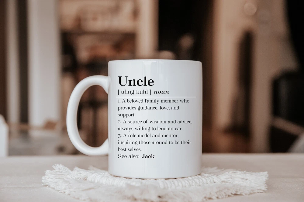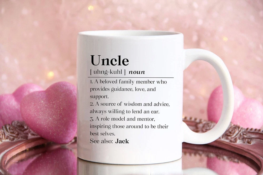 Personalized Uncle Fathers Day Mug Custom Uncle Definition Gift Sentimental Uncle Fathers Day Coffee Mug Custom Uncle Definition Gift Product Details.. This high quality 11oz. ceramic white mug has a premium hard coat that provides crisp and vibrant color reproduction sure to last for years. Perfect for all hot & cold beverages. The highest quality printing possible is used. It will never fade no matter how many times you wash it. Material: 100% Ceramic. Print both sides. Dishwasher and Microwave Safe. High Gloss + Premium White Finish. Printed in the U.S.A. Personalized & Custom. We support personalized and custom mug to add custom, when placing an order, you can add notes to the "order note" in shipping address section. Also you can contact us directly via message. Shipping Info. Ready to ship in 1 to 2 business days, All products are made-to-order and proudly printed in the United States. Shipped by USPS and DHL, You will receive your order in 5-7 days. Replace & Refund. All products are defective during shipping broken, chipped will be replaced free of charge. You are not satisfied with the product, we will refund 100% money to you. If any other issues arise, please do not hesitate to message, we would be more than happy to assist you.