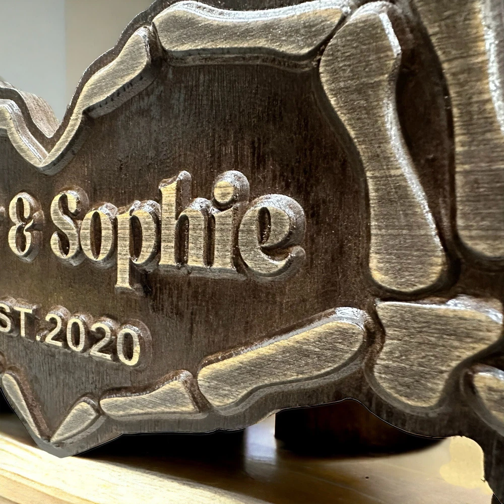 This amazing couple name sign would make a great gift for your boyfriend or girlfriend! This custom wooden sign is a unique and simple idea for an anniversary or Valentine's Day present. It's also a cute addition to your home decor. Plus, it's handmade in the USA by a small business located in East Texas. The sign measures 21 inches by 10 inches, so it's the perfect size for any room. The raised lettering creates an appealing 3D effect that adds depth and character to the piece. Please note that the lettering is a natural wood color. Each piece of wood is unique. The wood grain will be different and the stain may vary slightly but you are sure to get a beautiful one-of-a-kind piece. If you have any specific requests that are not listed, please feel free to message us and we will do our best to accommodate your needs.