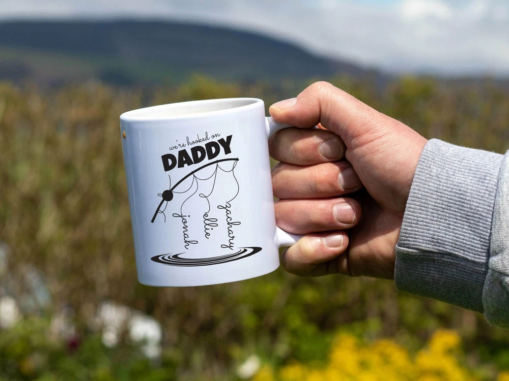 Personalized Were Hooked On Daddy Mug Perfect Fathers Day Gift For Dad With Product Details.. This high quality 11oz. ceramic white mug has a premium hard coat that provides crisp and vibrant color reproduction sure to last for years. Perfect for all hot & cold beverages. The highest quality printing possible is used. It will never fade no matter how many times you wash it. Material: 100% Ceramic. Print both sides. Dishwasher and Microwave Safe. High Gloss + Premium White Finish. Printed in the U.S.A. Personalized & Custom. We support personalized and custom mug to add custom, when placing an order, you can add notes to the "order note" in shipping address section. Also you can contact us directly via message. Shipping Info. Ready to ship in 1 to 2 business days, All products are made-to-order and proudly printed in the United States. Shipped by USPS and DHL, You will receive your order in 5-7 days. Replace & Refund. All products are defective during shipping broken, chipped will be replaced free of charge. You are not satisfied with the product, we will refund 100% money to you. If any other issues arise, please do not hesitate to message, we would be more than happy to assist you.