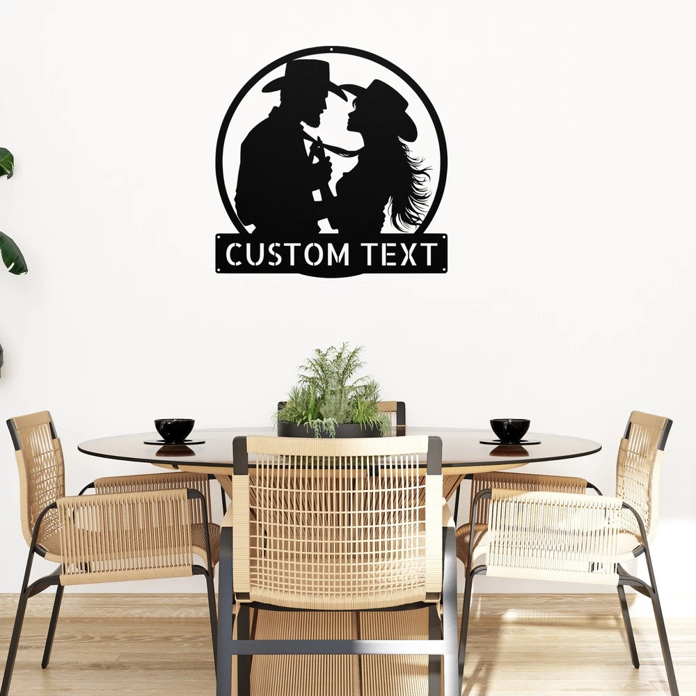 Product Description Personalized Western Couple Metal Sign Custom Rustic Decor Home Wall Art Gift Transform your space with this stunning Personalized Western Couple Metal Sign . Made from high-quality 16 gauge metal, this rustic decor piece is perfect for adding a unique touch to your home or office. Its durable powder coating ensures it’s resistant to dust, weather, and water, making it suitable for both indoor and outdoor use. Whether you’re looking for a thoughtful gift for Christmas, a birthday, or any special occasion, this personalized sign is sure to impress. It’s a wonderful way to celebrate love and companionship, or you can keep it for yourself as a charming addition to your decor. Key Features: Customizable Design : Personalize with names or initials for a unique touch. High-Quality Material : Made from durable 16 gauge metal for lasting beauty. Weather Resistant : Powder-coated finish protects against dust, rain, and sun. Versatile Decor : Ideal for both indoor and outdoor display. Perfect Gift : Great for weddings, anniversaries, holidays, or just because! Bring a touch of western charm to your life with this beautiful metal sign. It’s more than just decor; it’s a piece of art that celebrates special moments and makes any space feel like home. Order yours today! Service and Color Choice Our metal signs are designed to be personalized just for you, making them the perfect addition to any space! The default color for our signs is Black , but we also offer a variety of beautiful options including Copper, Gold, White, and Silver . After placing your order, simply contact us with your preferred color choice, and we'll ensure your sign is exactly how you envision it. Let’s create something special together!