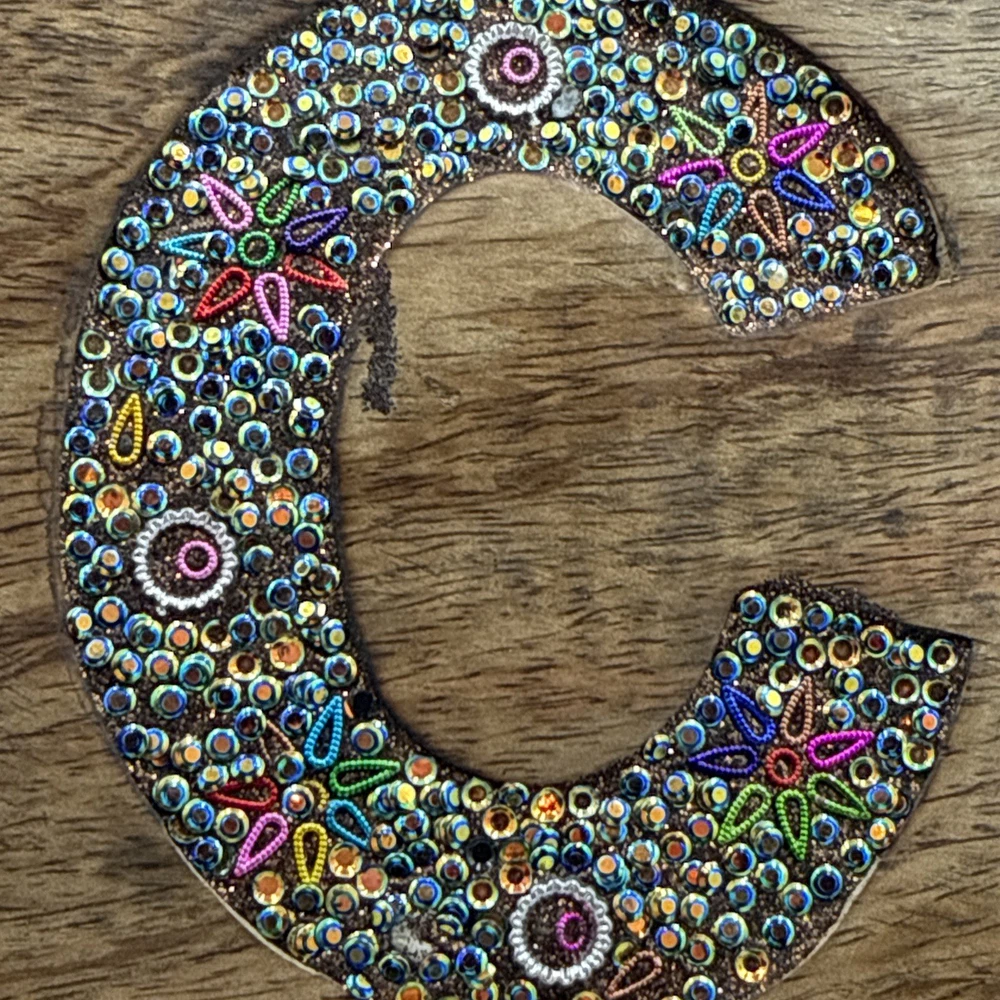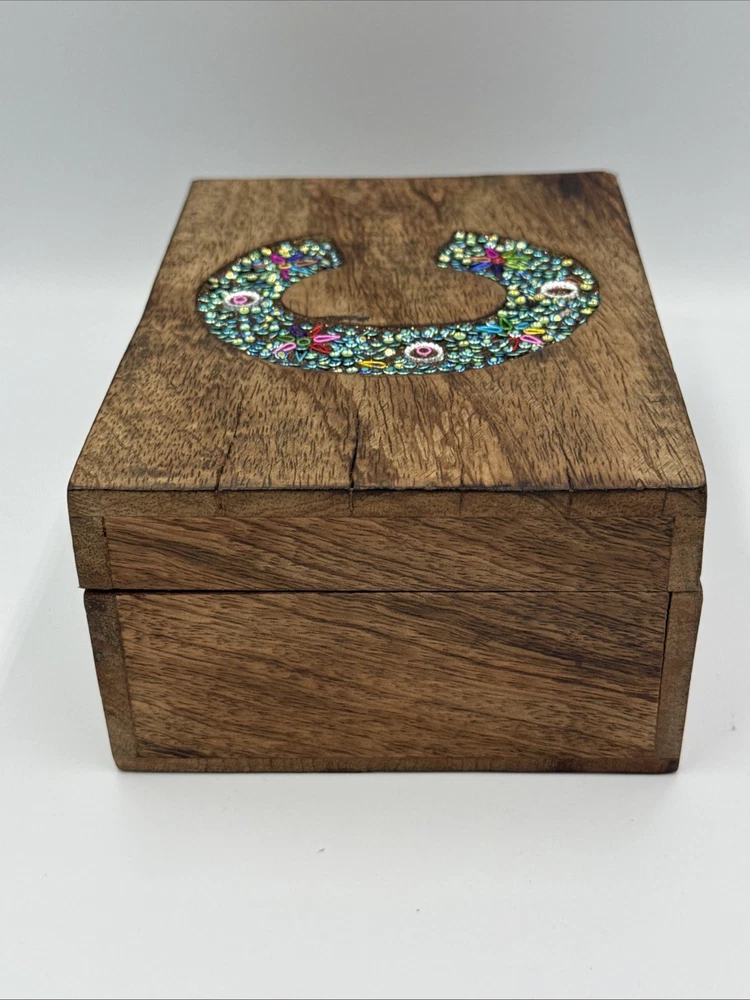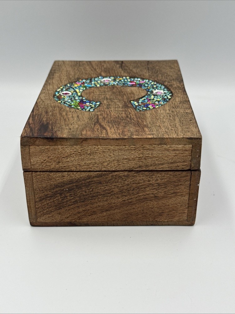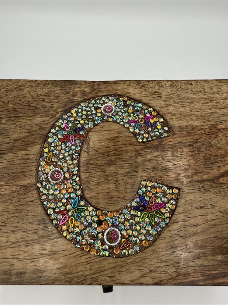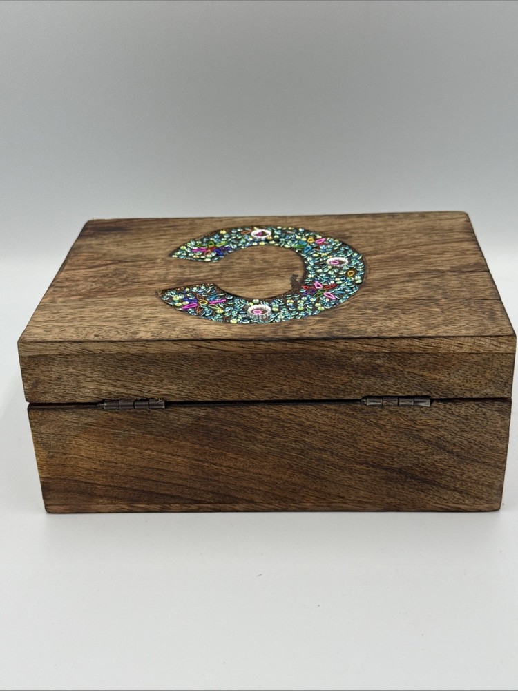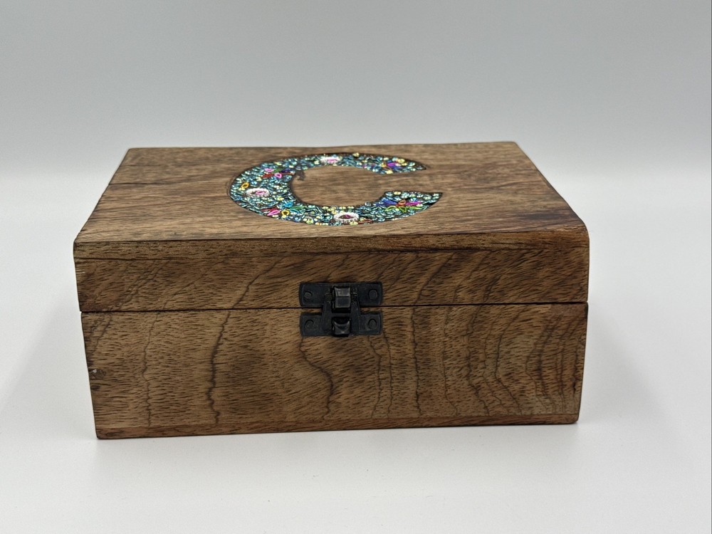 Cool Wooden Hinges Trinket Jewelry Box with initial inlaid "C" - WithRhinestones. Shipped with USPS Ground Advantage.