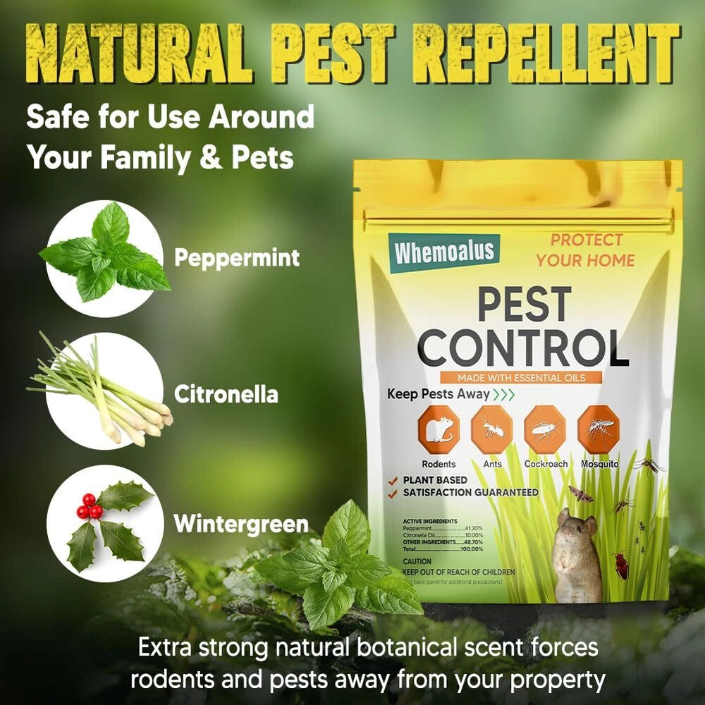 This PEST REPELLENT BALL is twice as effective as any other products. Formulated with a high-strength ingredients, our pest repellent balls create a strong barrier against rodents, spiders, roaches, ants, moths, and more, effectively keeping them out of your property. The small, lightweight design allows you to place the pest repellents balls discreetly in any area, and they start working immediately, releasing a pleasant scent while keeping pests at bay effortlessly. Each pack covers up to 120 sq ft for 1-3 months, effectively repelling all types of pests. EFFECTIVE PEST REPELLENT BALLS - This pest repellent is twice as effective as any other products. Formulated with a high-strength ingredients, our pest repellent balls create a strong barrier against rodents, spiders, roaches, ants, moths, and more, effectively keeping them out of your property. FAST ACTING - The formulate in this repellent smell great to people, but are highly irritating to pests. These mice repellent balls work quickly to repel rodents and pests, offer peace of mind for your home or business. EASY TO USE - Simply place the pest repeller balls in enclosed areas to repel spiders, rats, mice, silverfish, roaches, ants, and a variety of other pests. LONG LASTING PROPERTY PROTECTION - Each pack covers up to 120 sq ft for 1-3 months, effectively repelling all types of pests. Use them in basements, attics, pantries, cabins, garages, sheds, vehicles, and more for efficient protection. SAFE FOR HUMANS & PETS - Made with natural ingredients, these mouse repellent balls are safe for humans, pets, fruits, vegetables, and the environment when used as directed. Enjoy protection in a safe and eco-friendly manner.