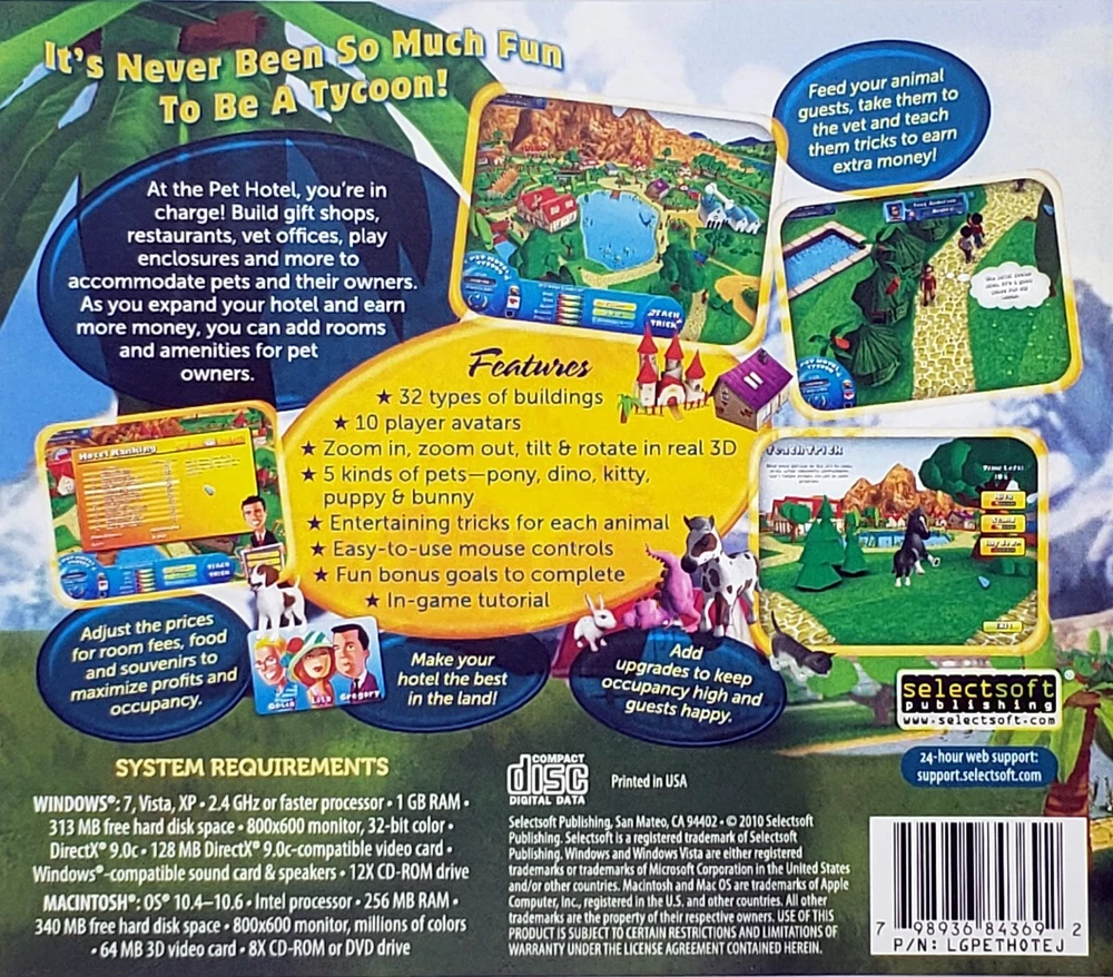 Current Discount Offers Serving the eBay Community Worldwide Since 1997! Pet Hotel Tycoon Build gift shops, restaurants, vet offices, play enclosures and more to accommodate pets and their owners. As you expand your hotel and earn more money, you can add rooms and amenities for pet owners. Adjust the prices for room fees, food and souvenirs to maximize profits and occupancy. Feed your animal guests, take them to the vet and teach them tricks to earn extra money! Add upgrades to keep occupancy high and guests happy. Features 32 types of buildings 5 kinds of pets: pony, dino, kitty, puppy & bunny Zoom in, zoom out, tilt & rotate in real 3D Entertaining tricks for each animal 10 player avatars In-game tutorial Easy-to-use mouse controls Fun bonus goals to complete Fun Upgrades & Mini-Games System Compatibility Tested Works With Windows XP, Vista, 7, 8 & 10 Product Condition / Packaging New in Sealed Retail Case With Cover Artwork Product Notes Close-out, final-sale clearance/liquiation item. No exchange, return nor refund. Outside USA : Product compatibility untested outside USA. Please see below. Shipping Ships in secure, protective packaging with delivery tracking. Orders ship first-in first out, usually early in posted handling time period. Please see "Shipping & Payments" section above for shipping services, with rates and estimated delivery dates. For any question, including special handling request, desired expedited shipping services (and rates) not shown or other, please eBay Message. Any current/subsequent contact or Paypal-payment note may not be seen prior to order shipment. Outside USA: Each bundled Item (pre-identified as a "Bundle" in listing) counts as only a single item to minimize shipping charge Payment We accept payment through eBay Managed Payments system. eBay system will automatically charge sales tax as applicable. Service / Support We are here to service all pre- and post-purchase questions. Returns always accepted within 30-days for any reason; buyer responsible for return delivery. Per eBay guidelines, please eBay Message us prior to posting any feedback other than positive, or taking other action, to provide us opportunity to resolve any issue. We do not claim to be product experts for each of 1000s software & DVD titles offered, but with 20+ years experience, may be able to help troubleshoot installation. (For post-installation usage help, please refer to on-screen documentation usually accessible within software, or in "help" file, else possibly available on Internet). Outside USA: Though compatibiilty tested within USA only, orders regularly fulfilled outside USA with rarely any reported issue. Our business hours: 9am - 6pm Pacific Time USA, Monday - Friday (except US Postal Holidays). eBay Message us (cyber-deals) by clicking on either: "Contact Seller" link in your order for this item in your Purchase History - (Best Method) "Ask A Question" link below in the Questions & Answers section on this listing page