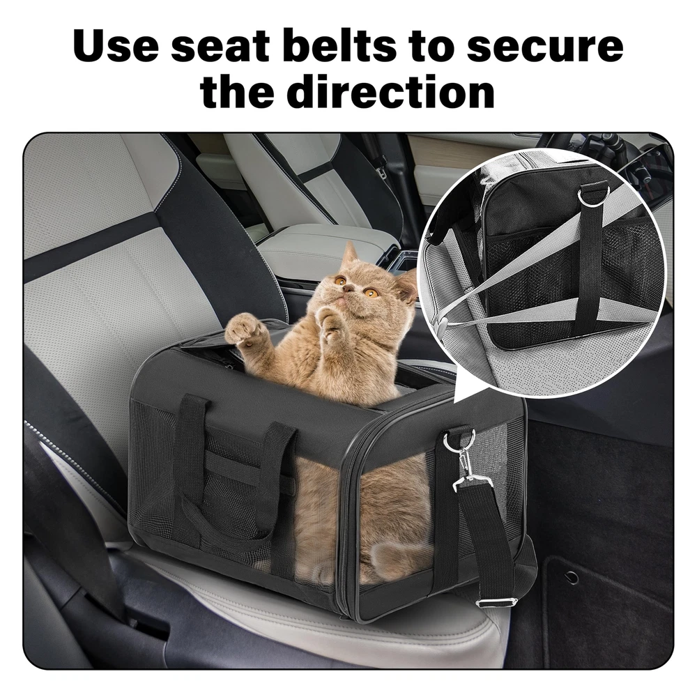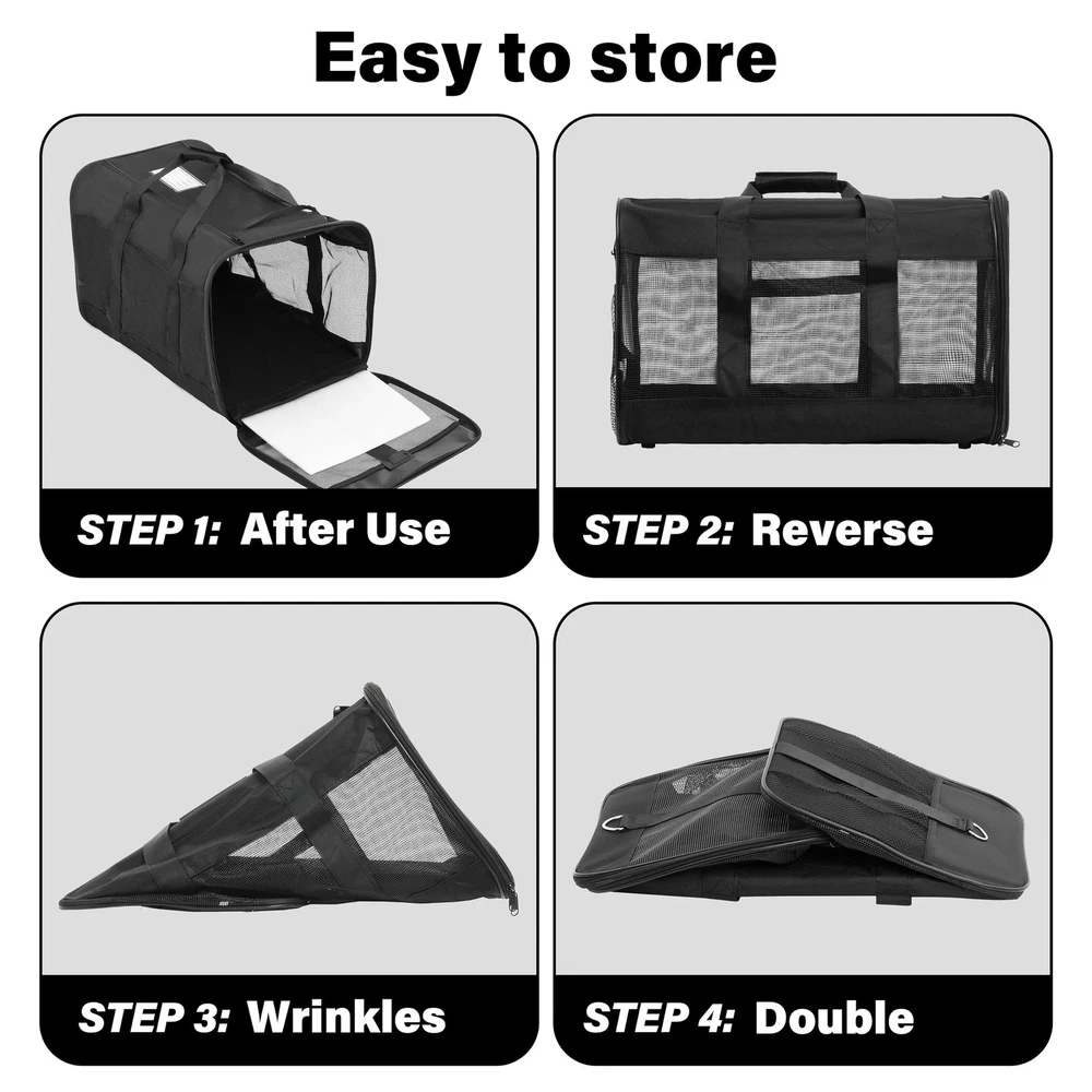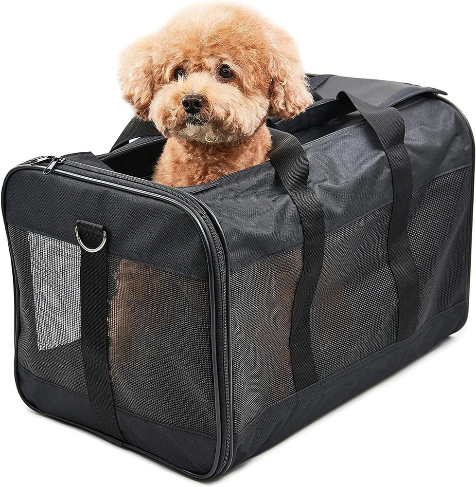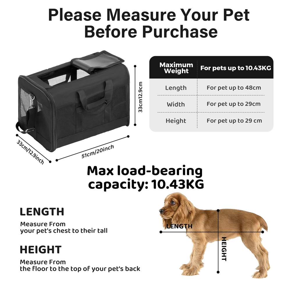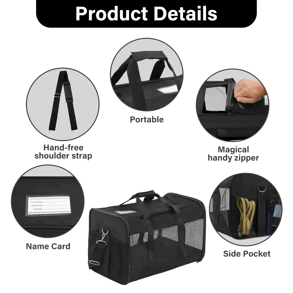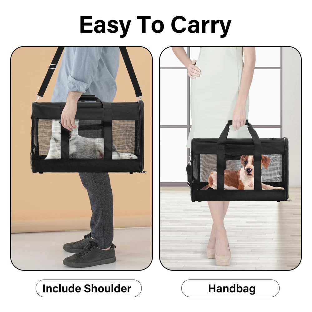 Black Soft-Sided Pet CarrierHelp your pet arrive safely and in style with this soft-sided pet carrier. Designed to keep your pet protected, secure, and comfortable, this all-black pet carrier works well when traveling by plane or car or for routine trips to the vet. Machine WashableThe cozy fleece pet bed can be completely removed and machine-washed; the carrier should be spot cleaned only. Dimensions and Max Load Weight17x12x12 inches (LxWxH)17 lbs (8 kg)Stable, Reliable DesignThe carrier provides connecting loop handles for balanced carrying and for functioning as a dual seatbelt for secure transport. An adjustable shoulder strap comes included for hands-free carrying. Even more, the soft-sided carrier features a spring wire frame that can be conformed to the under-seat dimensions of most major domestic airlines. The pet carrier features front and top openings, which allow for effortless entry and -free loading. A zipper on the front and double zippers on the top keep the openings securely closed during transport. Comfortable styleMesh ventilation on three sides not only provides adequate airflow, but also easy viewingperfect for your pet to look out and for you to check on your pet. Partially covering the carrier with a towel can sometimes create an added sense of safety, especially for cats. And provides a mesh pocket to place your pet's snacks. The pet carrier comes with a removable base insert, which creates a solid surface for your pet to stand on, along with a removable fleece pet bed, which offers a cozy sleeping space for your traveling pet. As needed, the fleece bed can be machine-washed. DIMENSION: Airline approved, 20”L x 13”W x 13”H perfect for small pets up to 23 lbs, fits comfortably under seat. Don’t select carrier based on weight only. Choose carrier based on pet’s measurements first and stay within maximum weight limit allowing enough space for your pet. SAFETY FIRST: Steel ring set and firmer wood bottom plate maintains stability. Locking zippers that prevent your pet from opening the carrier during travel. An internal leash keeps your pet secure inside the carrier. A little card to show your point, just in case. COMFORT MATTERS: Mesh windows ventilate, machine-washable faux lambskin liner and no-slip carrying strap. Front and rear pockets for convenient storage of treats, leash, bags, or anything else your pet might need on the go. EASY TO : Simple to when not in use. The collapsible design allows you to compactly and easily. We offer a 10-Year to our customer. If you ever have issues with your Pet carrier, simply us, and our professional team will rush an appropriate solution to you!