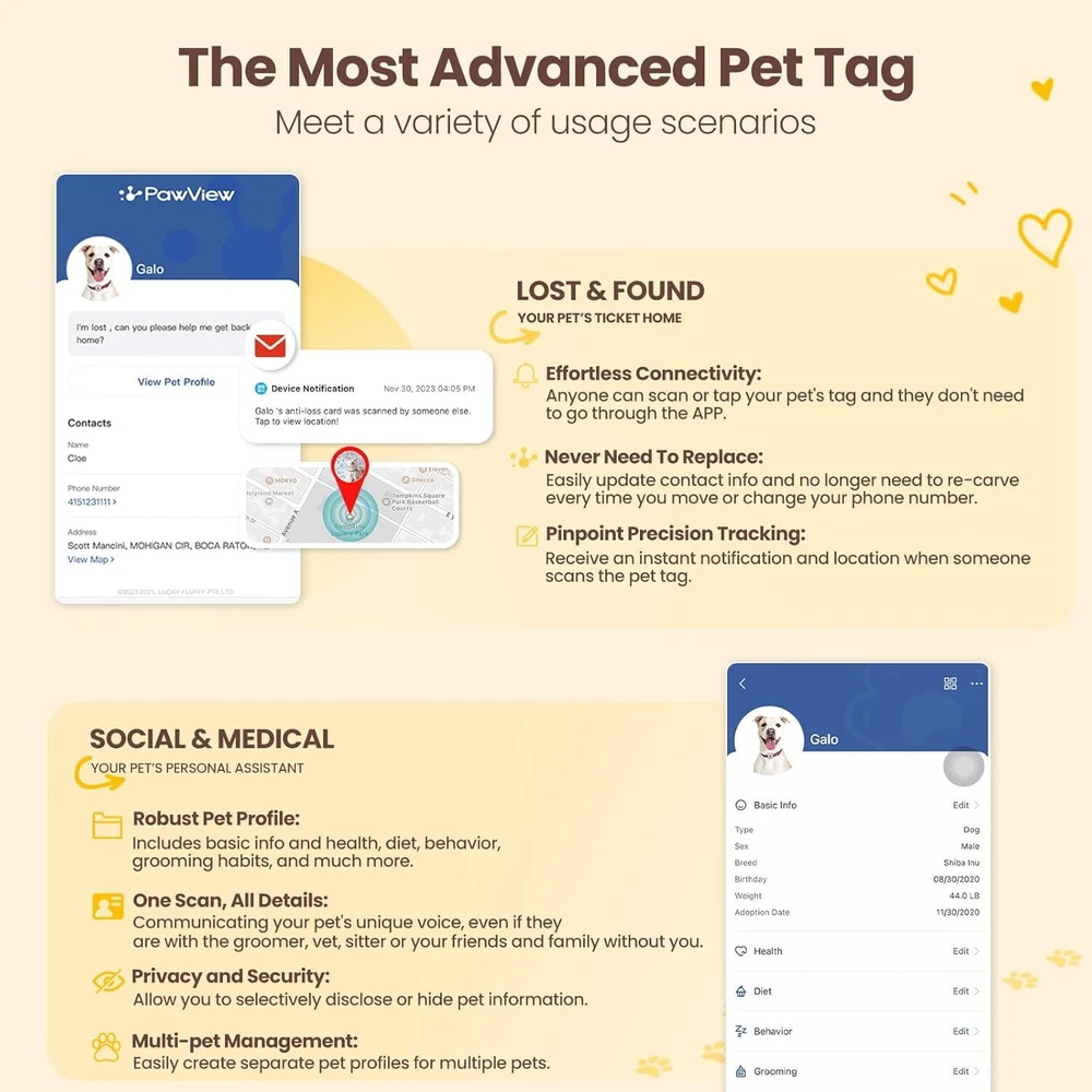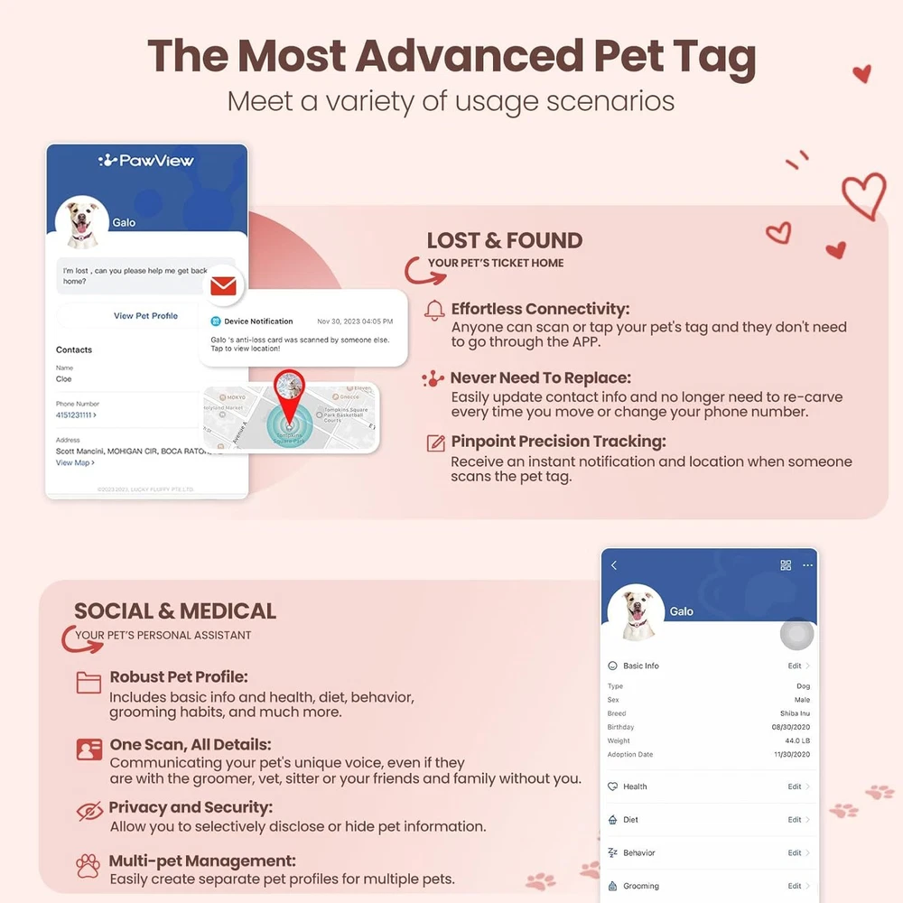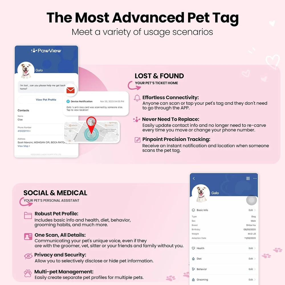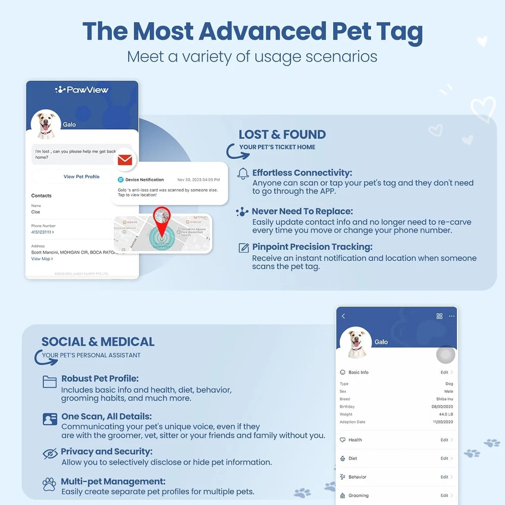 Product Description The video showcases the product in use. The video guides you through product setup. The video compares multiple products. The video shows the product being unpacked. From the brand Multifunctional AirTag Holder Smart Pet ID Tag PawView Slide On Pet Tag Brand Mission: Providing scientific pet caring, allowing pet lovers and pets around the world to share a healthy and happy life, becoming a solid guardian of pet happiness. Brand Vision: Striving to make sure that pet lovers no longer lose their pets, and becoming the most trusted brand among pet enthusiasts. Serving 150 million pet lovers, and becoming a global leader in enhancing the quality of pet life. Ensuring every pet enjoys scientific care; Let our products becoming the ultimate solution for scientific pet raising with lifelong trust of pet lovers.