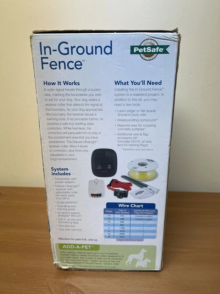 The PetSafe In-Ground Fence System model PIG0013661 is a brand new and sealed pet containment system designed by PetSafe. This electronic fence is suitable for dogs and provides a safe and effective way to keep pets within a designated area. The system utilizes in-ground wires to create a boundary for the dogs to safely roam within, providing them with the freedom to explore their surroundings while ensuring their safety and security. New sealed box. Shipped with USPS ground advantage.