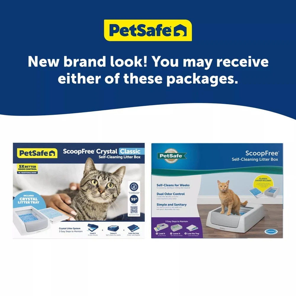 PetSafe ScoopFree Crystal Classic Automatic Self-Cleaning Cat Litter Box System DESCRIPTION Strike scooping the litter box off your to-do list. With the ScoopFree Crystal Classic Self-Cleaning Litter Box, there's no scooping, cleaning or refilling your cat's litter box for weeks. This litter box uses crystal litter which provides 5 times better odor control than traditional clumping litter. Crystal litter absorbs urine and dehydrates solid waste. This low-tracking litter also helps keep your floors clean because it is 99% dust free and doesn't stick to your cat's paws. Safety sensors make sure that the scooping cycle only occurs when your cat is out of the box. The disposable trays have a plastic lining to help protect against leaking, and each tray comes with a lid for quick and easy disposal--simply remove the tray and throw it away. Features: Let the Box Do the Work - No scooping, cleaning or refilling your cat's litter box for weeks Unbeatable Odor Control - Crystal litter removes smell by absorbing urine and dehydrating solid waste Includes one disposable ScoopFree Crystal litter tray with crystal litter No More Messy Floors - Low-tracking crystals are 99% dust free and don't stick to your cat's paws Leak Protection - Disposable trays have a plastic lining to help protect against leaking and keep your floors clean Easy Cleanup - Simply remove the tray and throw it away; each tray includes a lid for quick disposal Includes: Crystal Litter, Disposable Litter Tray, Operation Guide Intended Pet: Cat