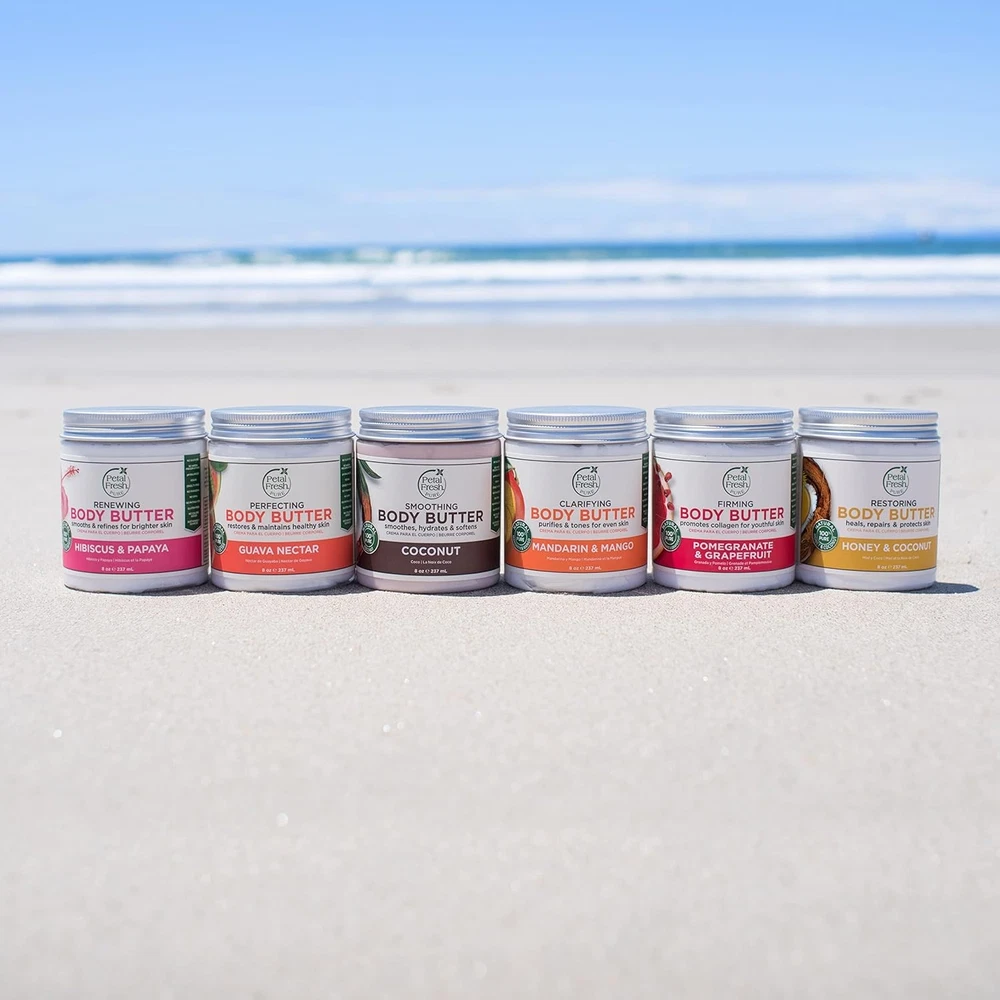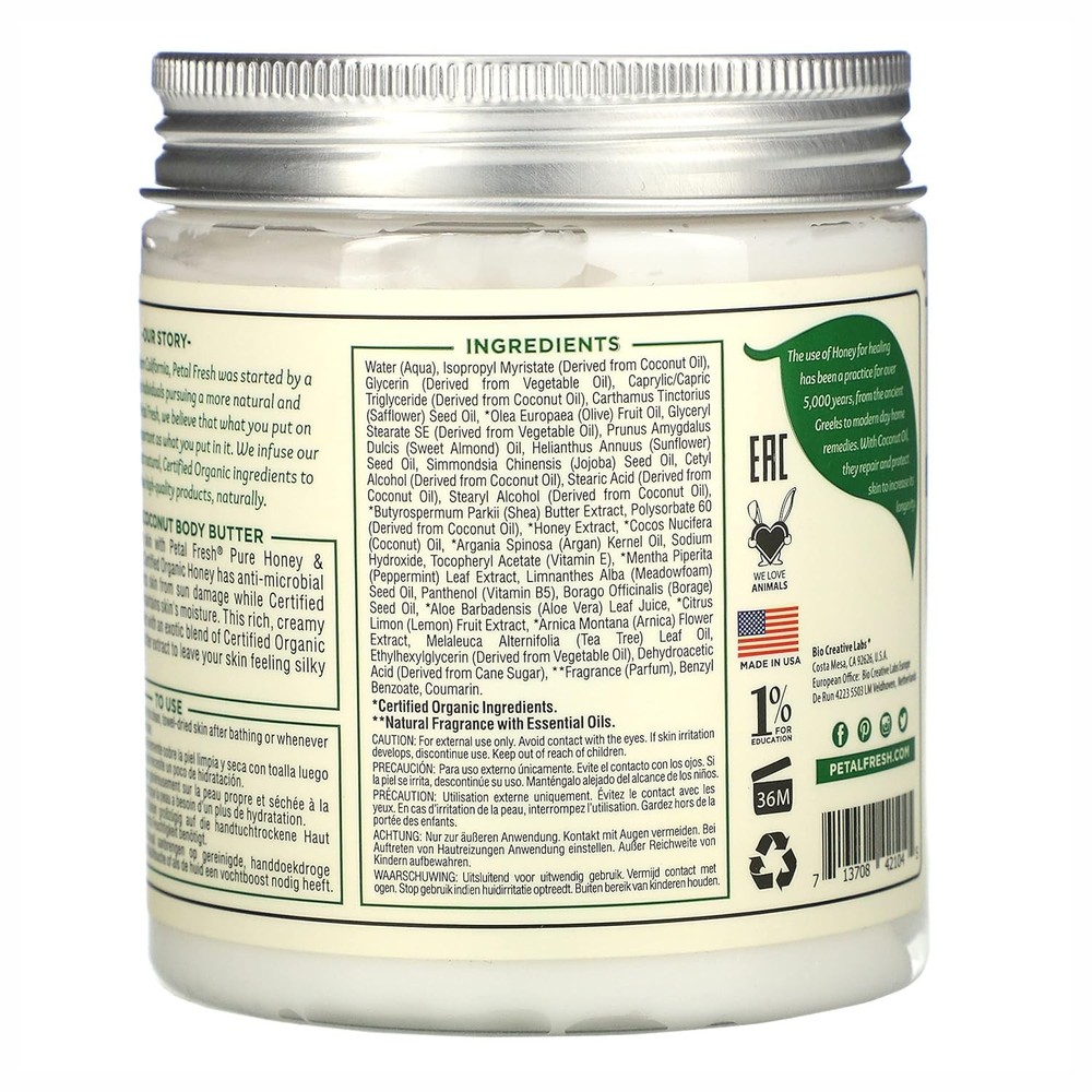 Petal Fresh Pure, Restoring Body Butter, Heals, Repairs & Protects Skin with Honey & Coconut Oil, 8 Fl oz Product Details Is Discontinued By Manufacturer : No Product Dimensions : 2.75 x 2.75 x 3.25 inches; 8 ounces Item model number : PF42104 Manufacturer : Petal Fresh Country of Origin : USA Brand: Petal Fresh Item Volume: 237 Milliliters Item dimensions L x W x H: 2.75 x 2.75 x 3.25 inches Age Range (Description): Adult Special Feature: Natural-Ingredients The use of Honey for healing has been a practice for over 5,000 years, from the ancient Greeks to modern day home remedies. With Coconut Oil, they repair and protect skin to increase its longevity. This rich, creamy formula is also fortified with an exotic blend of Certified Organic Argan Oil and Shea Butter extract to leave your skin feeling silky smooth to the touch. No harsh preservatives, parabens nor GMO's Vegan & cruelty-free. Refresh and help tighten your skin with the Body Butter from Petal Fresh. The antioxidant rich formula has essential oils to help leave your skin feeling silky smooth and smelling fantastic. Petal Fresh is an affordable, healthy choice because it uses high quality standards and natural ingredients to cleanse, nourish and produce healthier, more attractive hair and skin without using harsh chemicals.