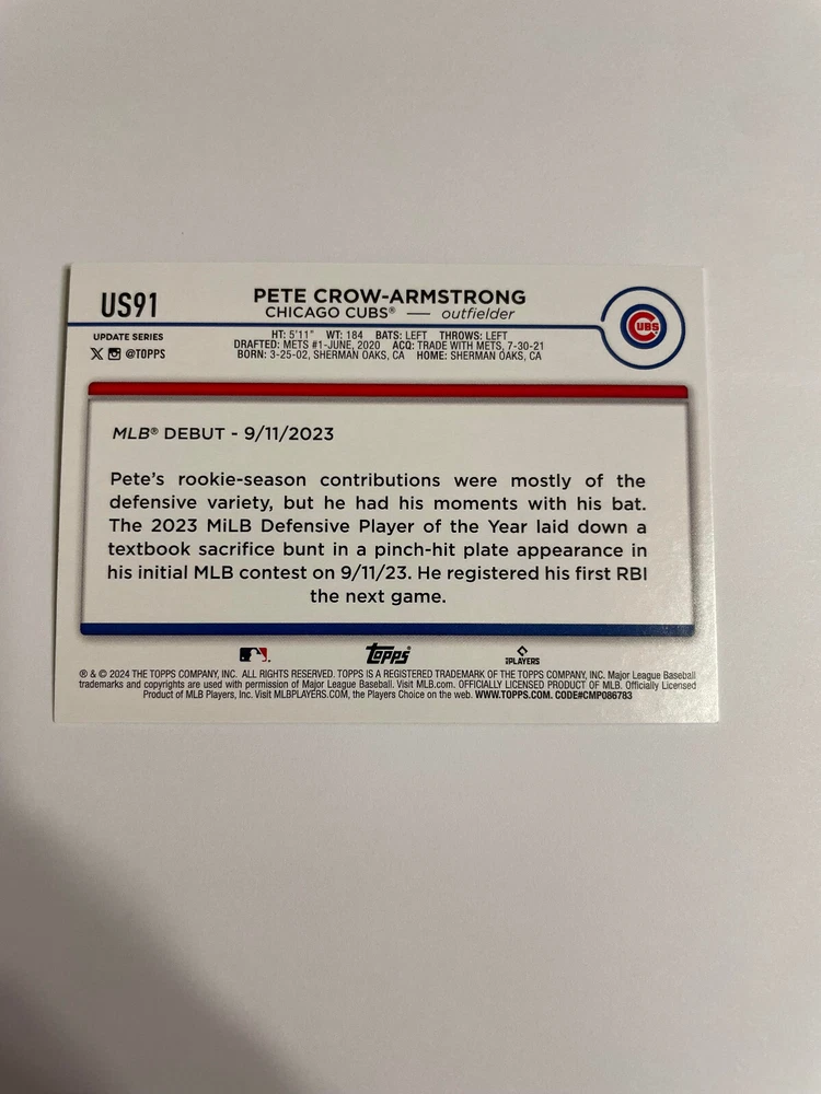 Pete Crow-Armstrong Holiday Foil Rookie RC 2024 Topps Update Card #US91 Cubs Card will ship in a penny sleeve in a top loader with additional protection.