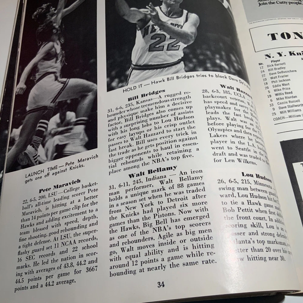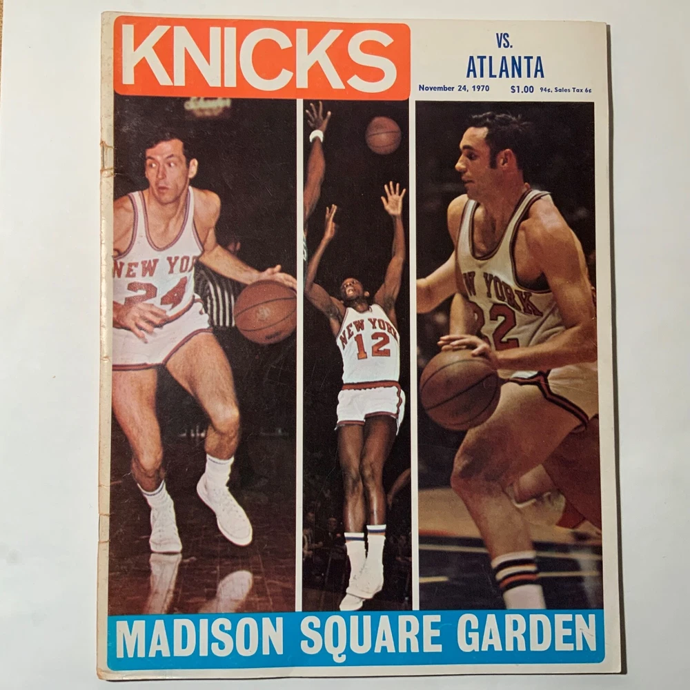 VG - EX. November 24, 1970 - Madison Square Garden. Program and ticket stub from early season game between the visiting Atlanta Hawks and the New York Knicks. Walt Frazier scored 33 points and Willis Reed put up a 23/19 double-double to lead the Knicks to a 128 - 119 victory. This was Hawks rookie Pete Maravich’s first regular season NBA game at Madison Square Garden, and he responded by scoring 40 points for the first time in his young career. Bill Bridges chipped in 21 points & 20 rebounds in the losing effort.