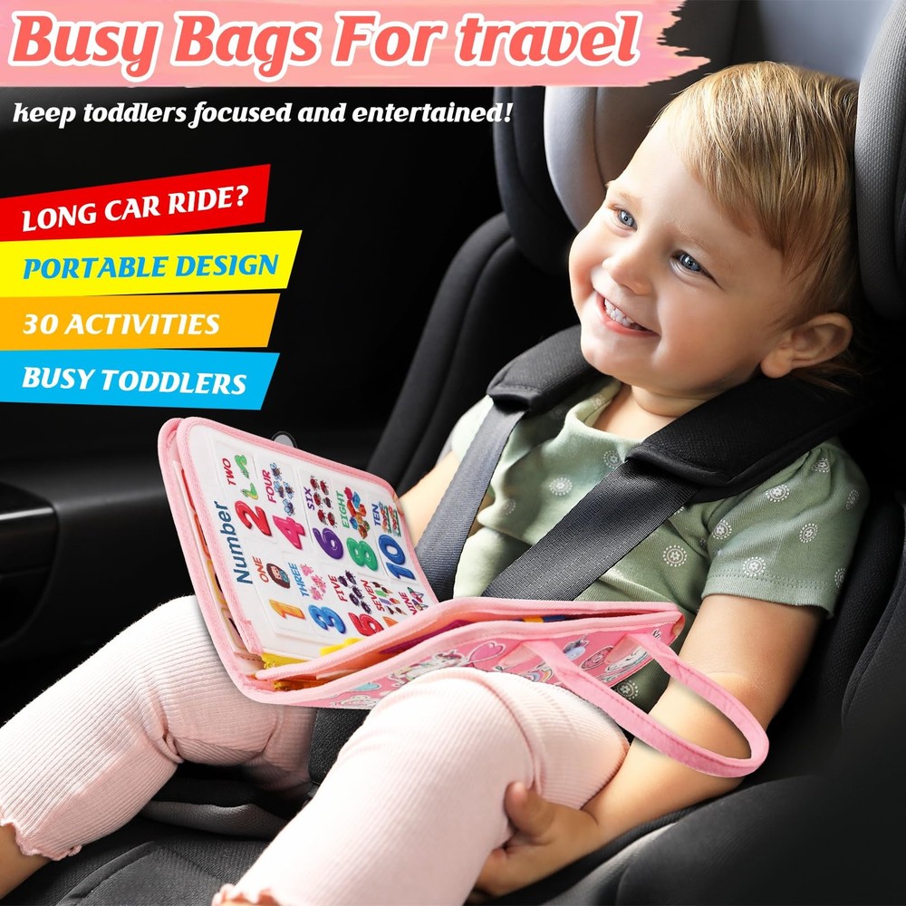 Product Features 1.[Premium Quality and Safety]: Crafted with care, our busy book for toddlers 1-3 2-4 3-5 is made from high-quality snd soft felt fabric, ensuring durability and safety for toddlers. Its soft yet sturdy construction can withstand the active play of toddlers. All components are securely attached, eliminating choking hazards and providing peace of mind for parents of 3-5 year olds 2.[Develop Cognition]: The alphabet, number, shape, color, animal and weather board are great simple learning activities for toddlers through preschool. Our busy board montessori toy for toddlers includes 26 letters, 10 numbers, 12 colors, 12 shapes, 9 animals, 9 weather patterns, and 15 basic life skills. Toddlers can sort and match answer sheets to the board 3.[Developing Life Skills]: The kids busy board features 10 sensory activities, based on real-life simulations, self-directed learning, and collaborative play. It can help to improve your toddler's fine motor skills, strengthen hand-eye coordination, and develop creative and logical thinking and problem-solving skills while playing. The toddler activity board teaches toddlers how to get dressed, buckle, snap, button, tie and some basic knowledge 4.[Portable Toddler Travel Toys]: At 11×13 inches and designed with handles for easy carrying, perfectly fit in most diaper bags and it is great quiet option for airplane or car travel, keep them busy and engage little hands and minds on the go 5.[Ideal Gift for Boys and Girls]: Perfect gift choice. This combination of children's travel and educational toys makes it a creative and practical gift suitable for birthdays, Easter, Christmas, New Year, Halloween, and Thanksgiving for boys and girls Product Specification: Material: felt and plastic Size: L: 28 cm/ 11 in W: 4.5 cm/ 1.77 in H: 33.5 cm/ 13.2 in Net Weight: 272.16 gram/ 0.6 pound 【Busy Board for Toddlers 1-3 2-4 Year learning Old】This toddler busy board is a educational toy for 1 2 3 4 years old to learning basic life skills. The sensory board can simulate essential real-life scenes and help your kids to develop basic skills, interest to explore and play. A preschool learning toys for your toddler to explore by themselves! 【24-IN-1 MONTESSORI TOY】Our Montessori Busy board has 8 pages and feature 24 montessori toddler activities, Include Alphabet, Numbers, Colours, clock, shapes, Animals, Dress Skills. It can help to improve your 1-3 2-4 year toddler's fine motor skills, strengthen hand-eye coordination, and develop creative and logical thinking and problem-solving skills while playing. 【Portable Toddlers Busy Book Toys for Travel】for airplane or car travel, keep them busy and engage little hands and minds on the go. Its light and compact design is convenient for you to carry around, keep your kids playing and keeping quiet in the game or learning. a great choice for travel toy and toddler activities. 【SECURE & DURABLE Learning TOY】Our activity board for toddlers is made from soft felt fabrics which is non-toxic and soft with no sharp edges and all parts are securely fixed. With tons of engaging activities for kids to explore, your kids will engage in the joy of sensory learning. 【WONDERFUL PRESENTS】Are you still hesitating about what gift to give to 1 2 3 4 5 year old girls ? Our busy board aims to cultivate dressing skills, finger dexterity, fine motor skills and cognitive skills. It's perfect as a birthday, Easter, Christmas gift for preschool children.