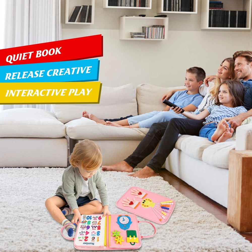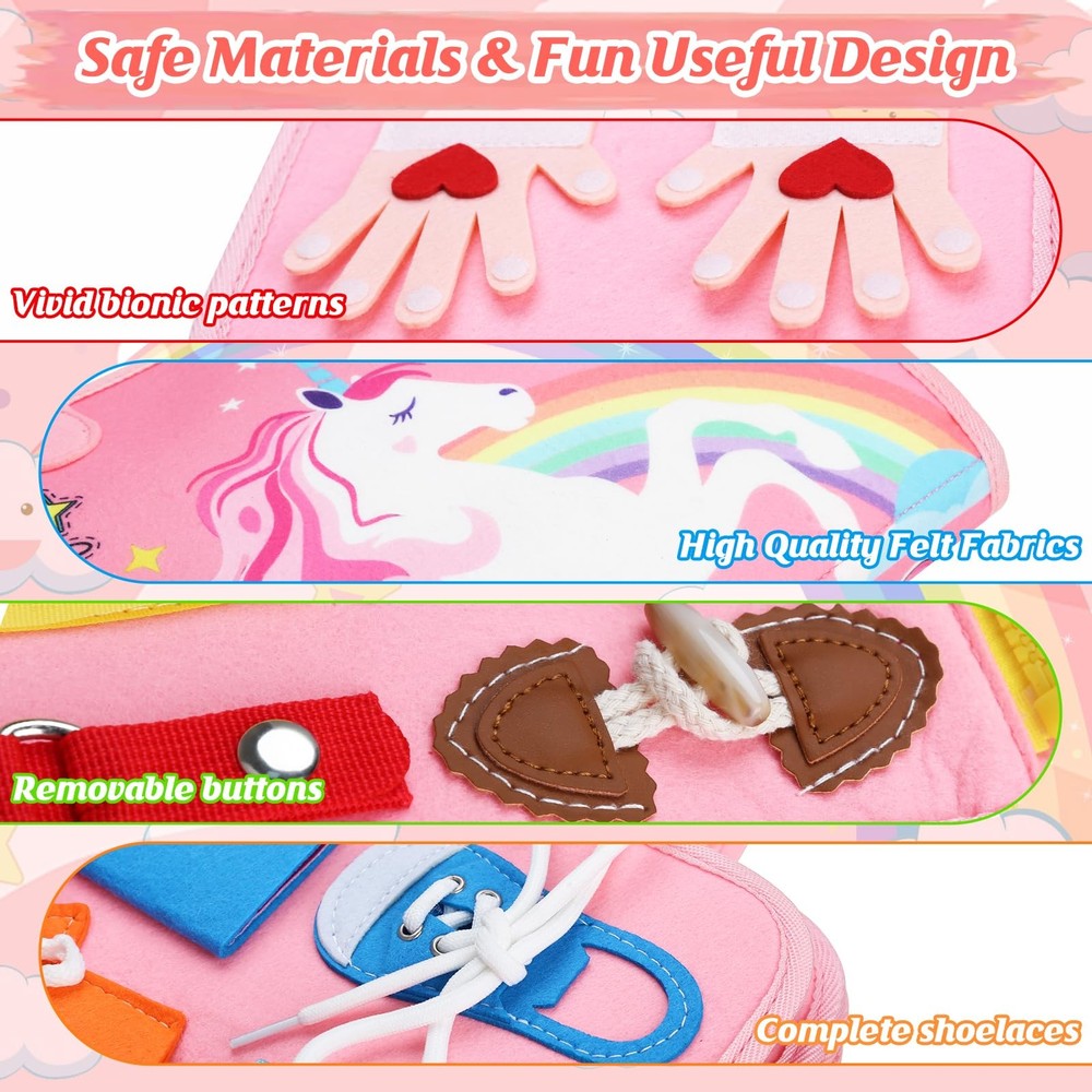 This busy board is a game-changer for little ones! The soft felt is super safe but tough enough for curious hands, and everything stays securely attached—no worrying about loose pieces. My toddler loves the bright colors and different activities like matching shapes and learning letters. It keeps them engaged while sneakily teaching early skills. Perfect for travel or quiet time at home—total win for parents!
