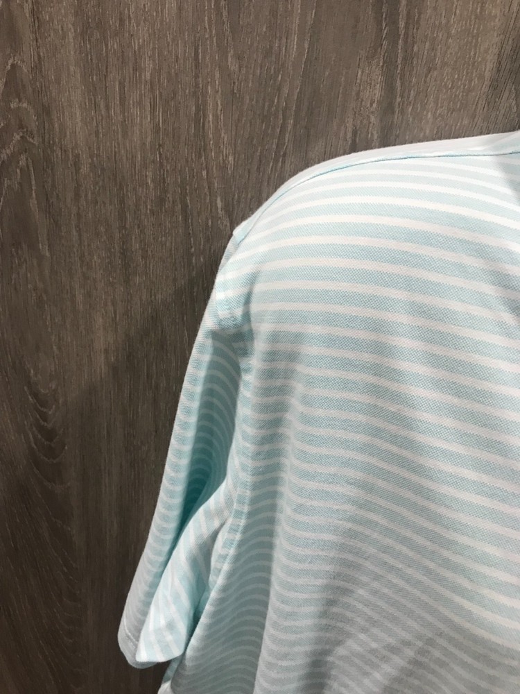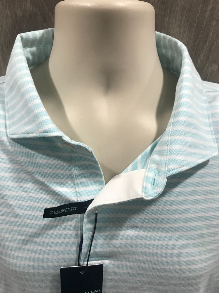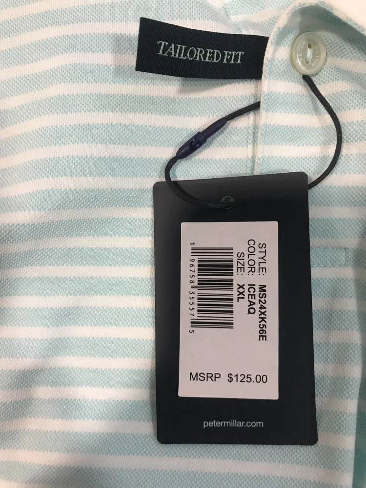 Description: Peter Millar Crown Crafted Men's (Size XXL) Ice Aqua Short Sleeve Striped Performance Mesh Polo . (See pictures) Brand: Peter Millar Gender: Men Size: XXL Color: Ice Aqua Pattern : Striped Material: 67% pima cotton, 28% polyester , 5% spandex Condition: New with tags MSRP: $125 Buy It Now Price: $64.99 Shipping: Free Note: Picture Accuracy is about 90%. Slight variance in color may result, due to lighting and camera default settings.